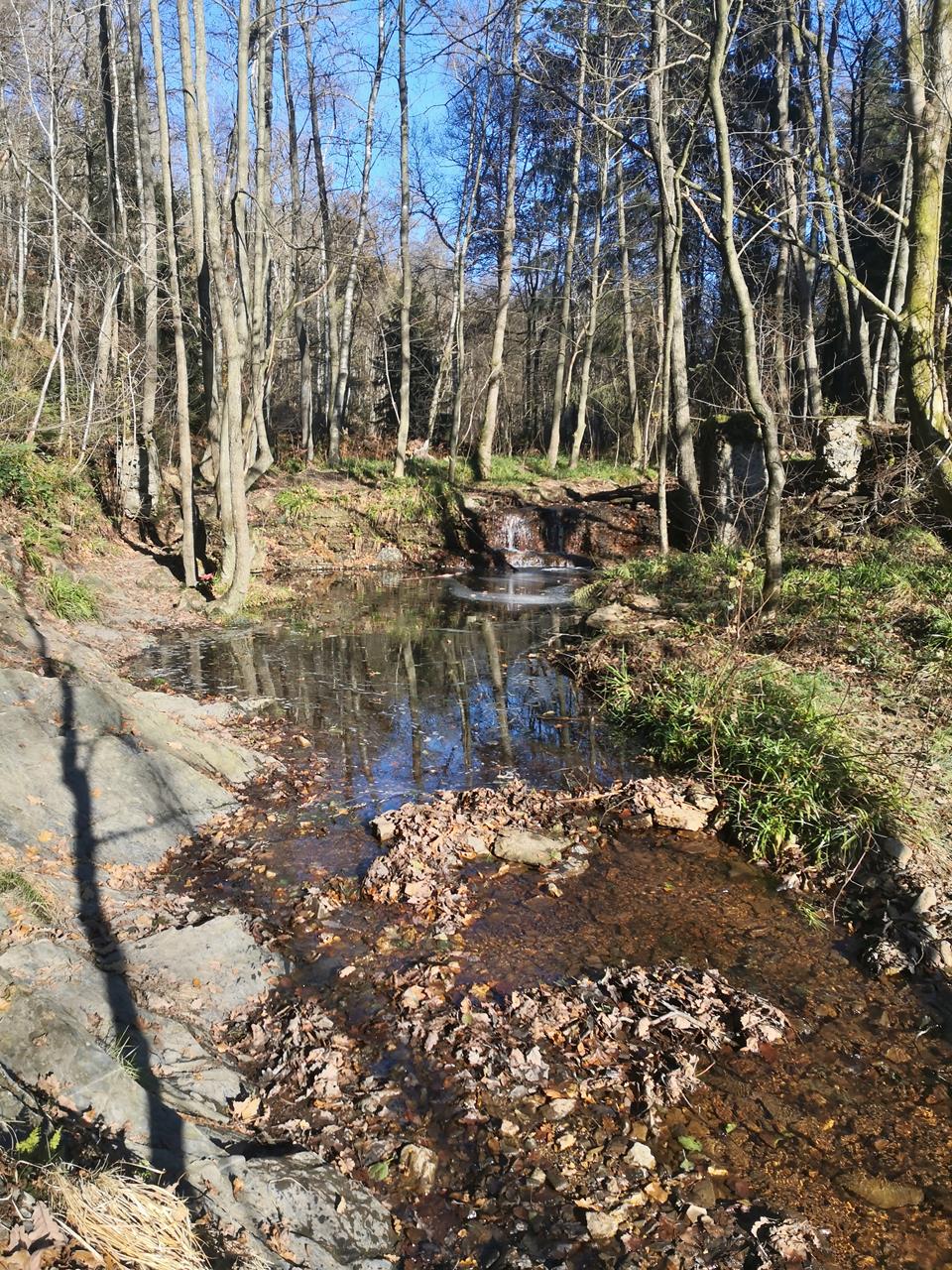 Zahlreiche Bäche und Gräben entwässern das Gebiet und münden schließlich in der Talsperre. Wir passieren einige dieser Bäche und machen einmal mitten im Bachbett auf großen Findlingen Rast. Um uns herum rauscht das Wasser, in der Luft liegt intensives Vogelgezwitscher. Ein wunderbares Naturerlebnis.