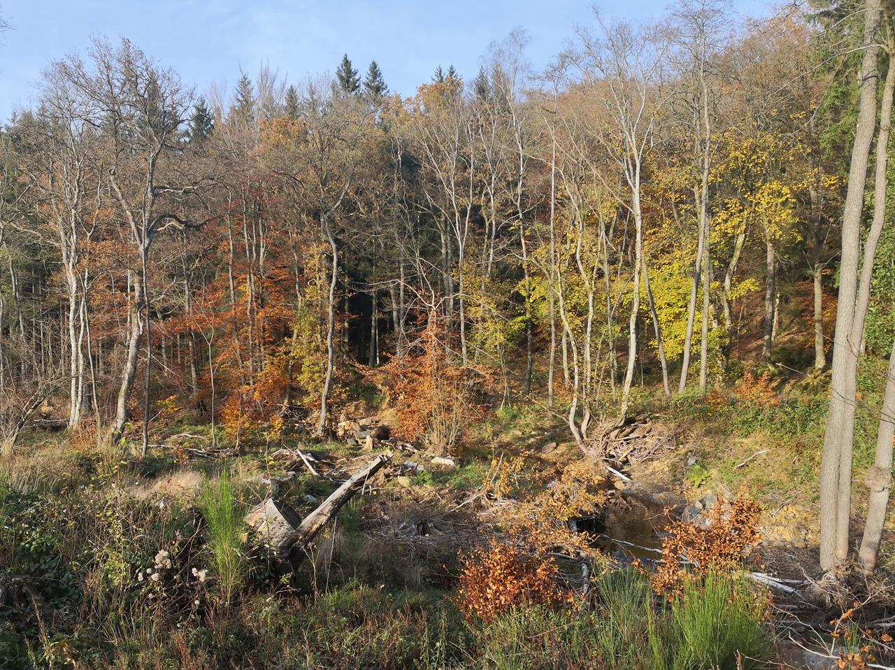 Entlang eines Bachlaufs steigen wir durch den Wald hinauf in Richtung des NSG Struffelt
