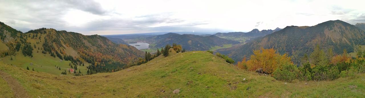 Blick vom Nordgrat des Brecherspitz hinunter zum Schliersee. Im Hochtal vorne links die Anklalm.