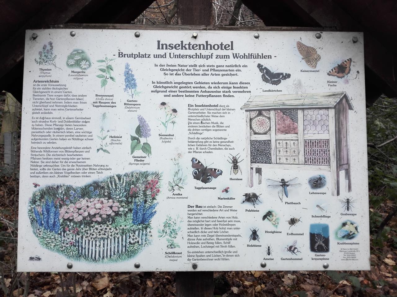 Infotafel an einem Insektenhotel entlang des Wanderweges