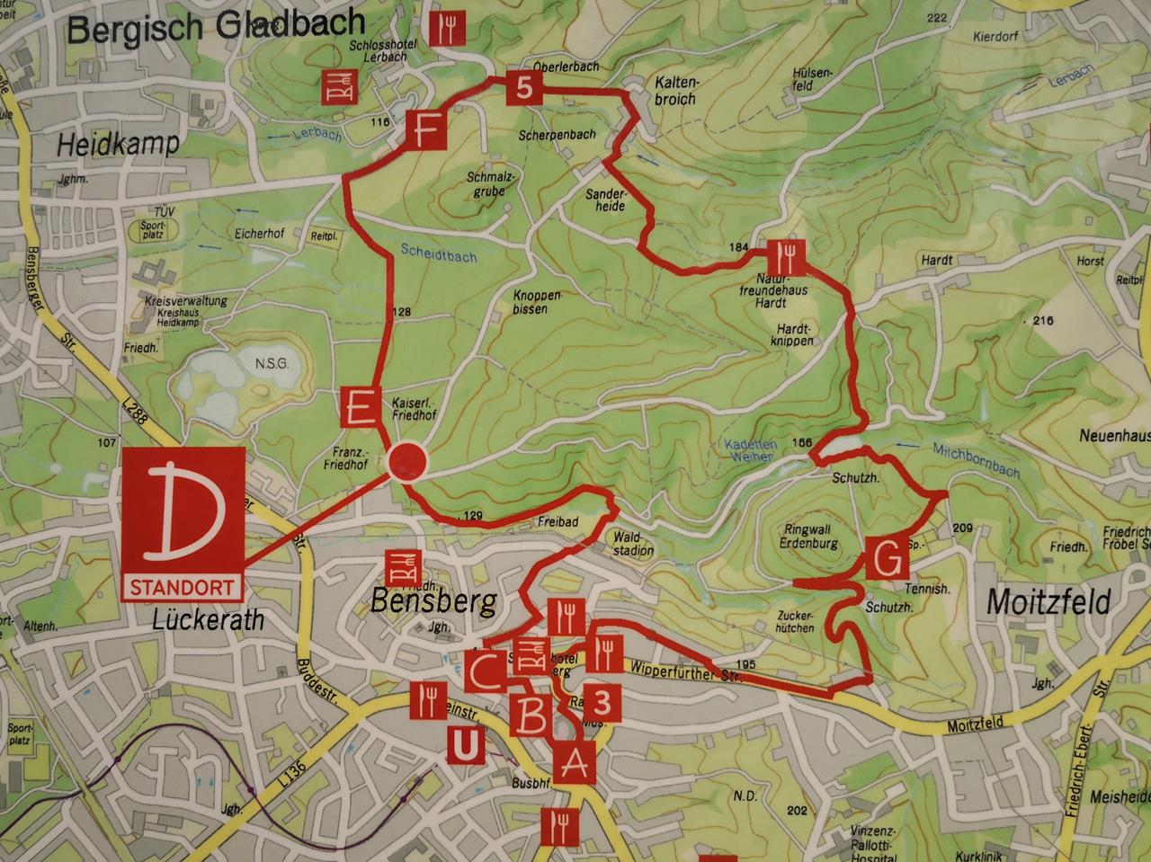 Am Ende unserer Wanderung zwischen Bensberg und Bergisch Gladbach schauen wir uns die Innenstadt von Bensberg an, die von zwei äußerst markanten Bauten überragt wird: Dem historischen Schloss Bensberg und dem architektonisch beeindruckenden Rathaus, das in den Resten der ehemaligen Burg Bensberg errichtet wurde.