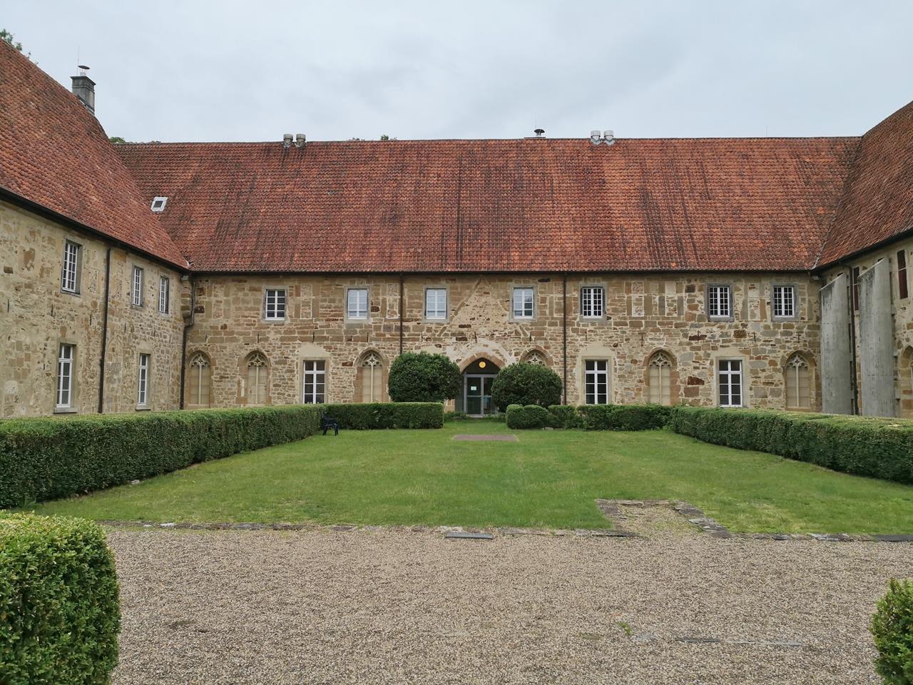 Richtig idyllisch ist es hier: Auf den Wiesen am Park stolzen Störche umher und gleich hinter dem Kloster fließt die Ems durch eine naturbelassene Auenlandschaft.Ich laufe mit Doxi durch den Park an den Gradierwerken vorbei zum Kloster, das 1437 mit Erlaubnis des Hochstifts Münster durch den Orden vom Heiligen Kreuz gegründet wurde. Zugleich erhielten die Mönche das Recht der Salzgewinnung und der Fischerei in der angrenzenden Ems.