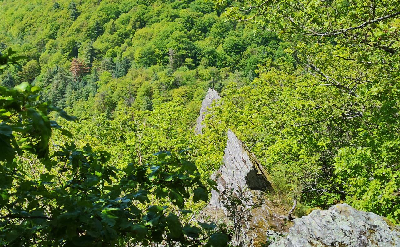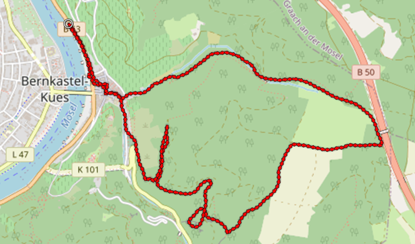 Wir drehen an dieser Stelle wieder in Richtung Bernkastel-Kues ab. Es geht steil durch den Wald hinab, vorbei am „goldenen Kreuz“ auf einem exponierten Felssporn, und weiter zum Aussichtspunkt „Kaiserstuhl“. Von dort blicken wir wunderbar hinunter ins Moseltal nach Bernkaste-Kues und weiter bis nach Zeltingen-Rachtig, wo wir gestern unterwegs waren.
