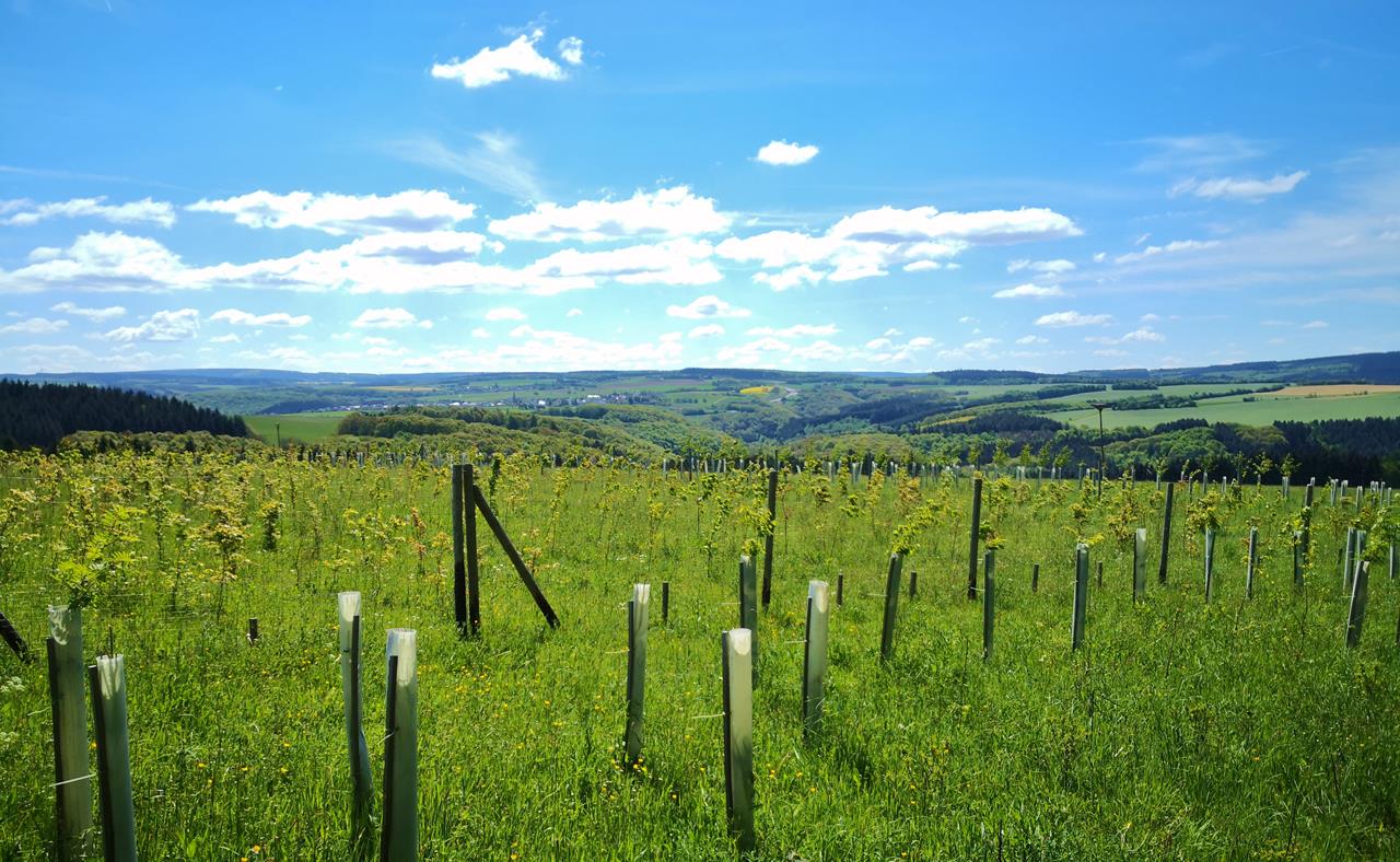Nach einer kurzen Waldpassage stellen sich unvermittelt wunderbare Fernblicke in den Hunsrück ein. Zwischen grünen Kornfeldern und gelben Rapsflächen erscheint am Horizont der Ort Longkamp.