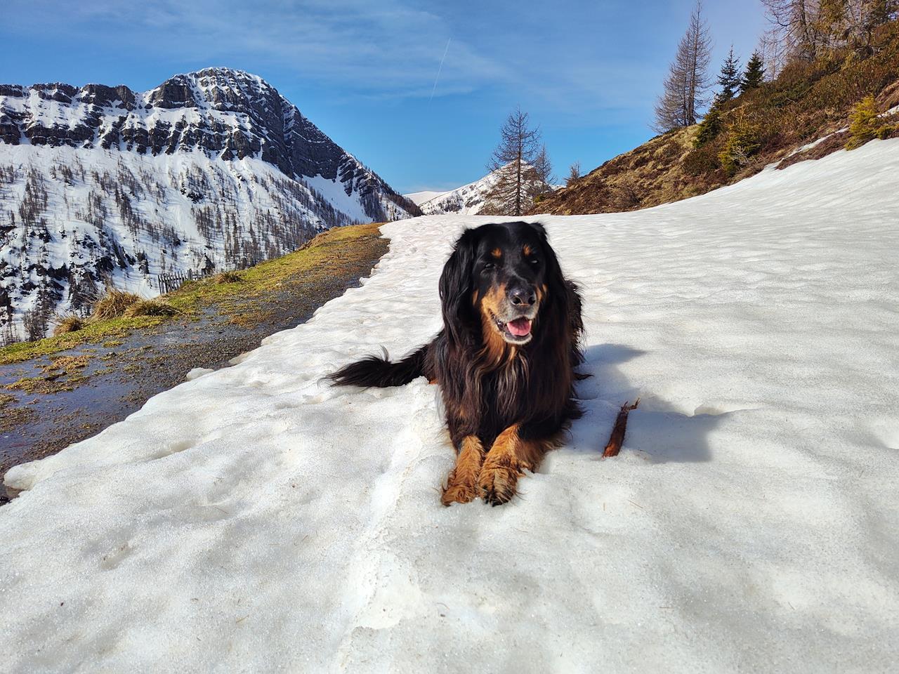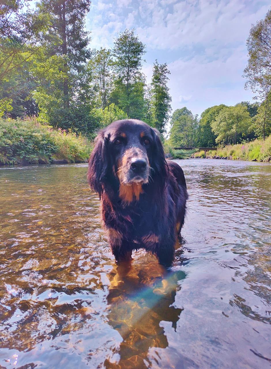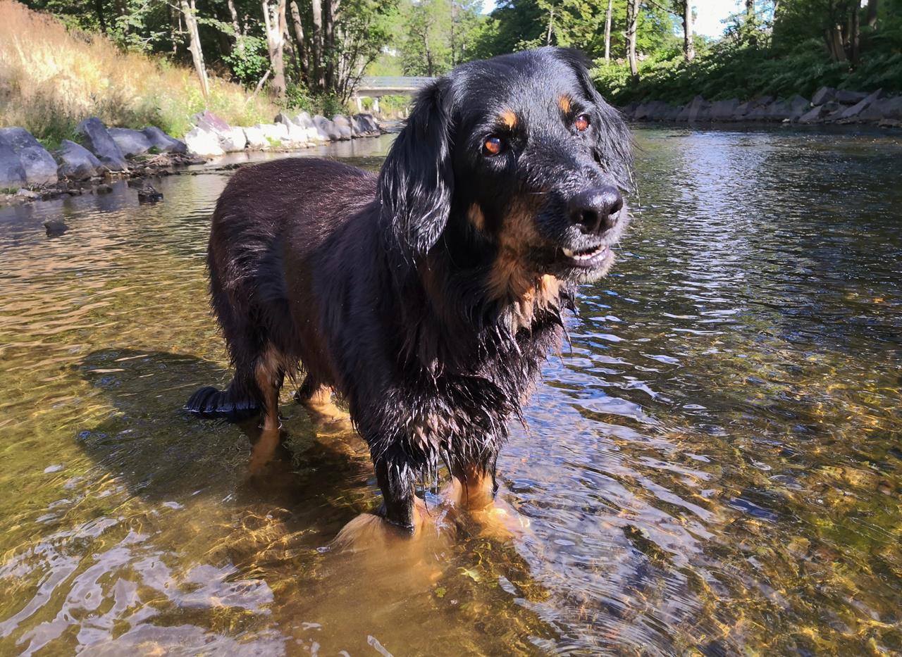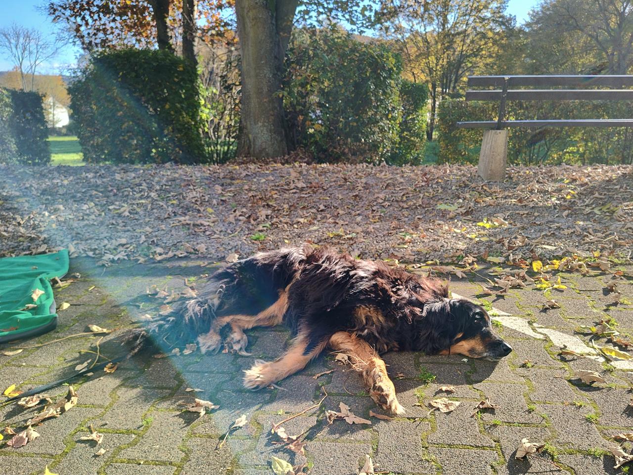 Doxi hat in den vergangenen 12 Monaten in den Hinterläufen deutlich an Kraft verloren. Auf gerader Strecke können wir noch so acht oder neun Kilometer mit ihr wandern, sofern es nicht zu heiß ist. Aber Treppensteigen, Bergauflaufen oder Rennen funktioniert nicht mehr gut. Das ist dem Alter geschuldet. Es geht allerdings schon wieder etwas besser seit einer großen Zahn-OP im Oktober. Davor muss sie eine Weile schlimme Zahnschmerzen gehabt haben.