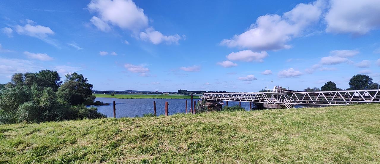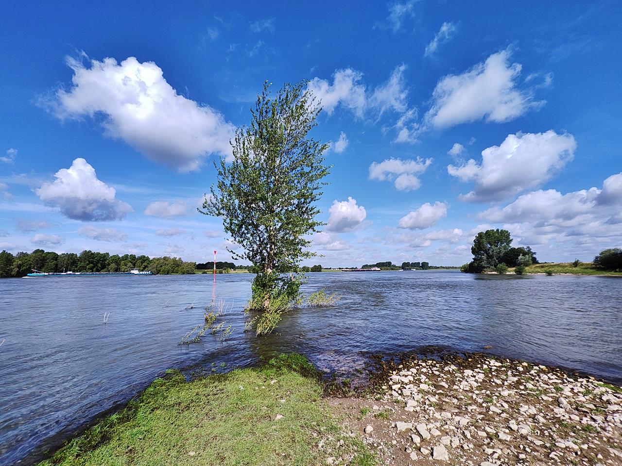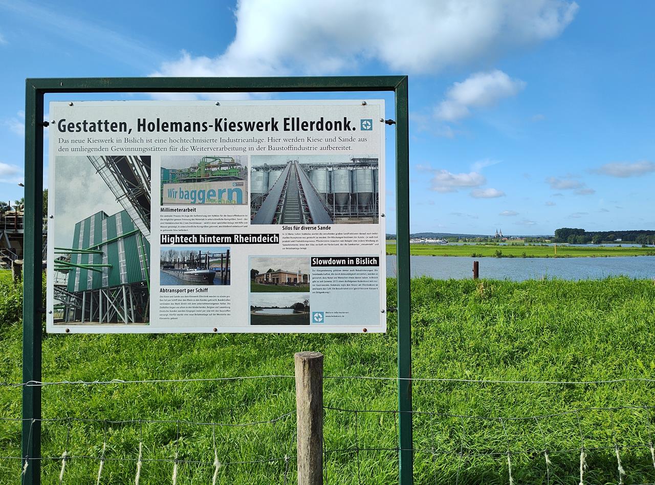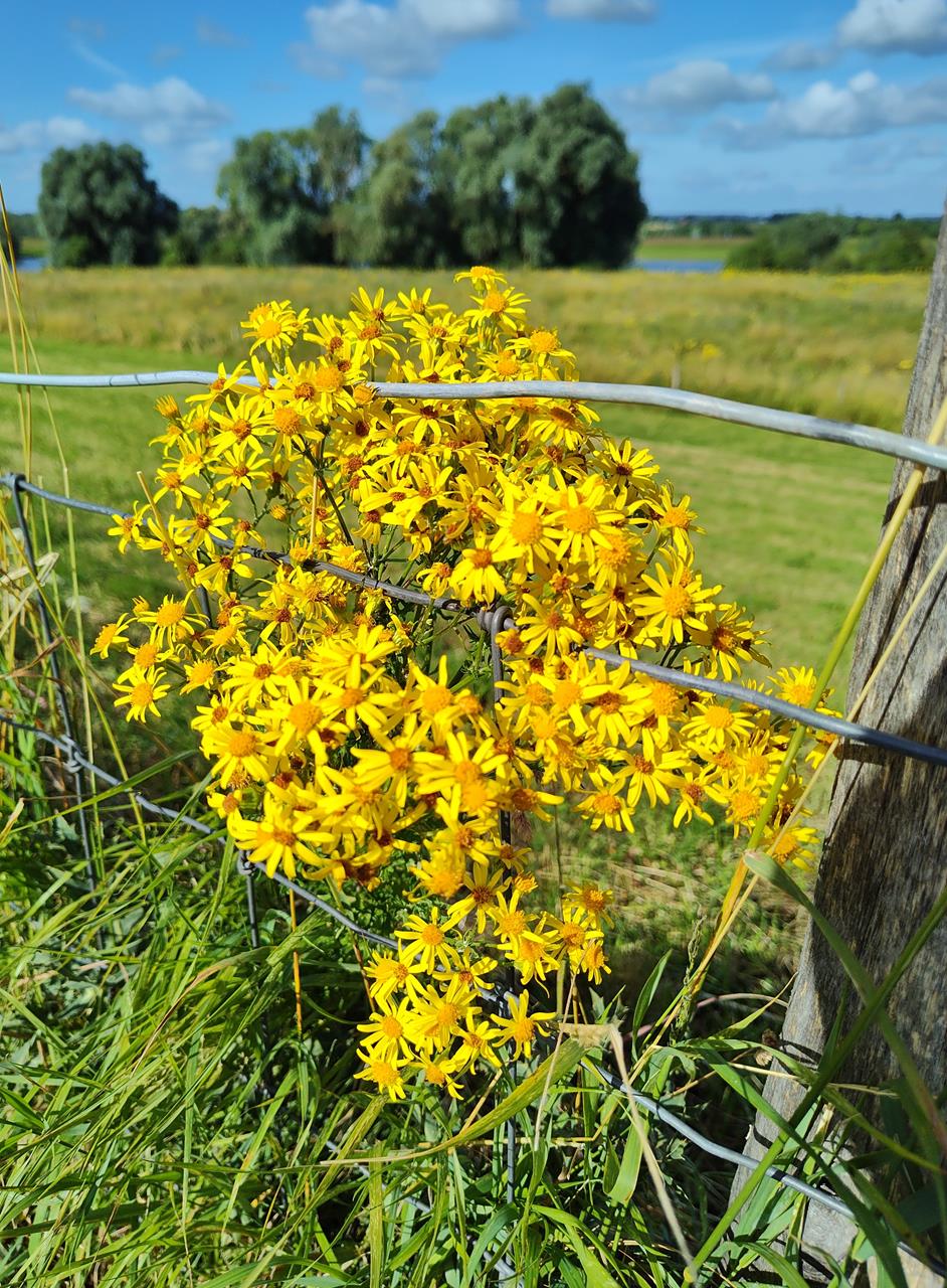 Ich bin mit Doxi unterwegs auf der Storchenroute von Bislich am nördlichen Niederrhein gegenüber von Xanten. Die 10 km lange Tour führt uns vorbei an mehreren Storchennestern in der Nähe der Feuchtwiesen am Rhein.Überall sehe ich in den Nestern drei oder vier Nachwuchsstörche, die jetzt im Juli fast schon so groß sind wie ihre Eltern. Bald werden sie zum ersten Male fliegen und dann spätestens Ende August ihr Nest verlassen.