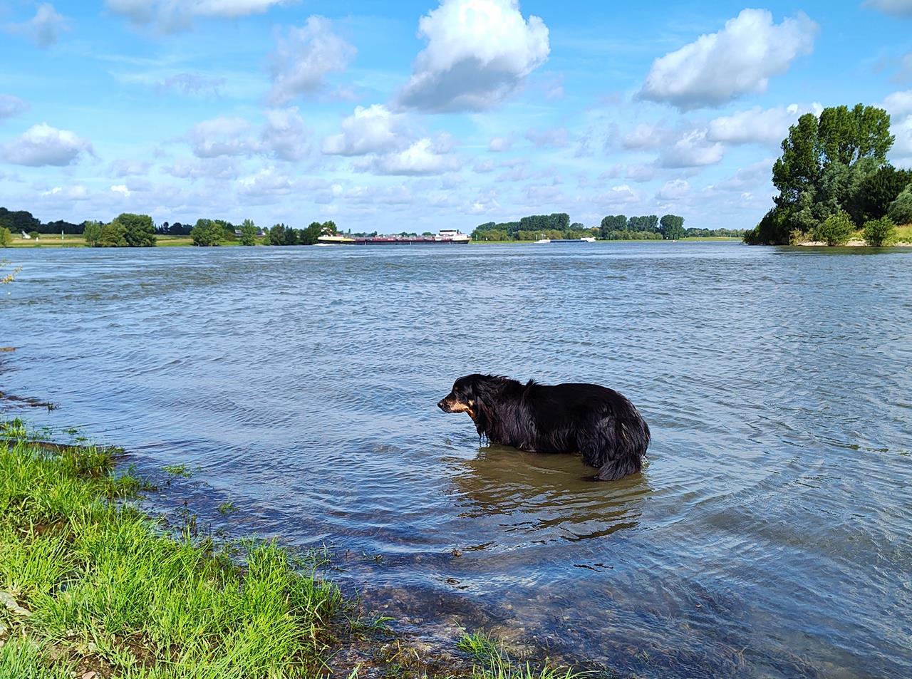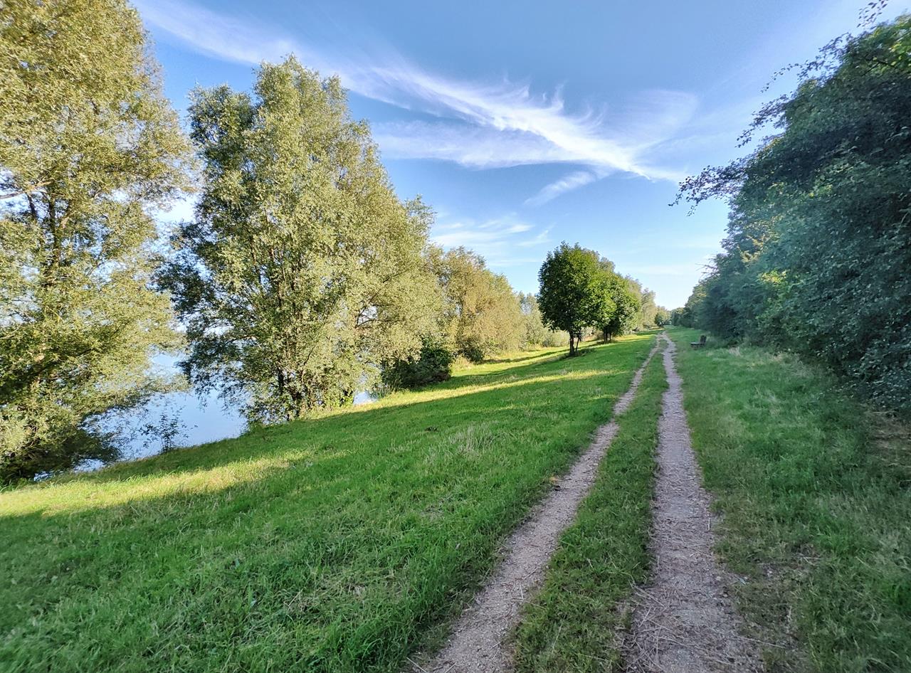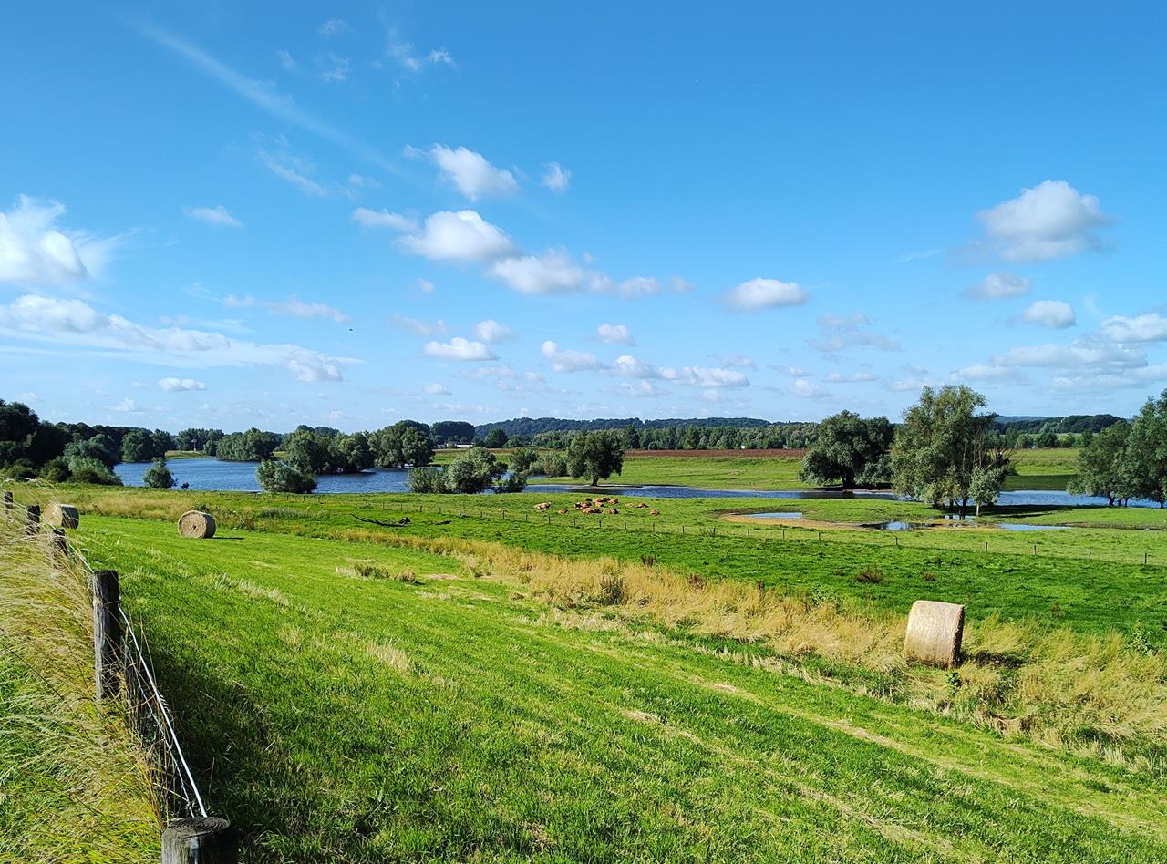 Ich bin mit Doxi unterwegs auf der Storchenroute von Bislich am nördlichen Niederrhein gegenüber von Xanten. Die 10 km lange Tour führt uns vorbei an mehreren Storchennestern in der Nähe der Feuchtwiesen am Rhein.Überall sehe ich in den Nestern drei oder vier Nachwuchsstörche, die jetzt im Juli fast schon so groß sind wie ihre Eltern. Bald werden sie zum ersten Male fliegen und dann spätestens Ende August ihr Nest verlassen.
