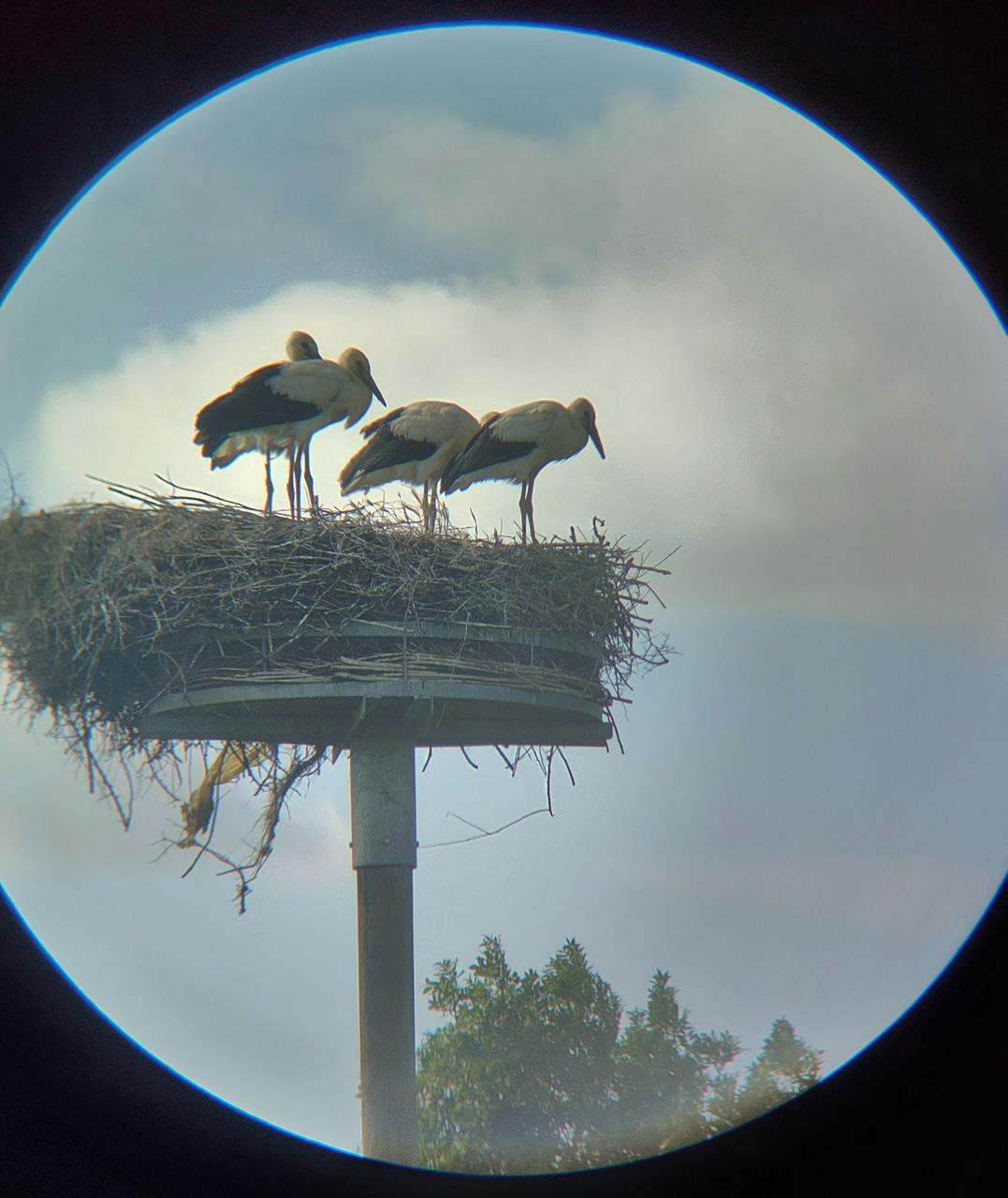 Bei so viel Nachwuchs wäre aber auch gar kein Platz mehr für die großen „Kleinen“ und ihre Elterntiere in einem Nest. Heute ist herrliches Wanderwetter: nicht zu warm und mit weißen Wolken unter einem blauen Himmel. Da lässt sich der Blick auf den Storchennachwuchs richtig genießen.