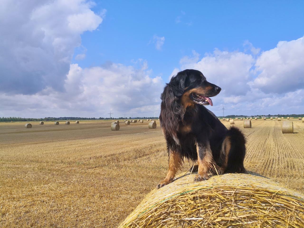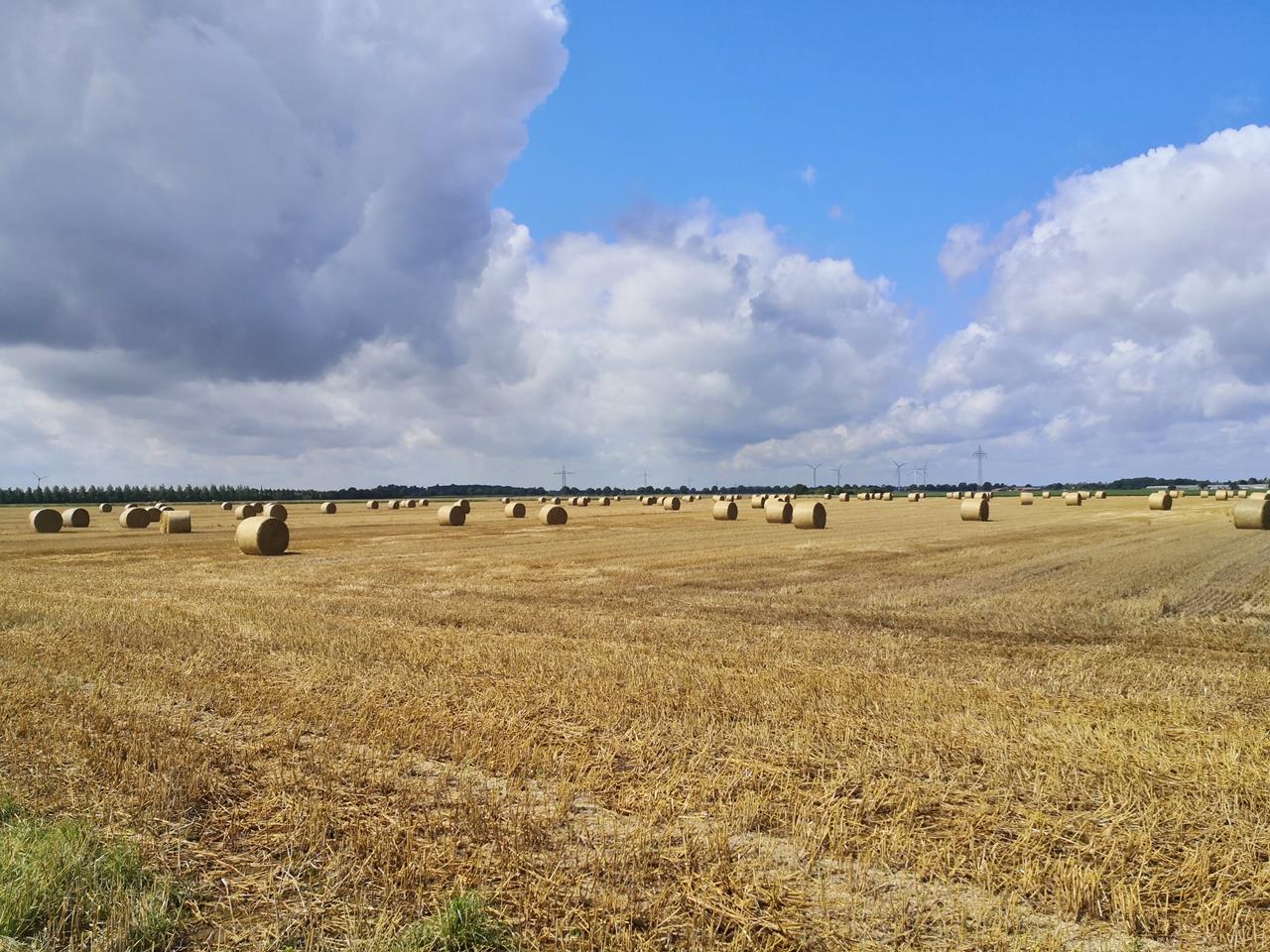 Dahinter rollen die Strohsammler durchs Feld. Sie nehmen das Stroh auf, pressen und stampfen unentwegt und lassen alle paar hundert Meter große runde Ballen zurück – alle von gleicher Größe.Viele davon werden bald schon in den zahllosen Reitställen unserer Region landen.