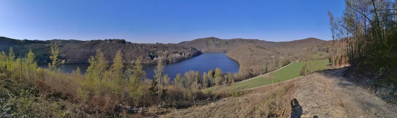 Auf dem ersten Abschnitt geht es entlang des Uferwegs, mit wunderbaren Blicken auf den blau schimmernden Obersee.Dann steigen wir am Hosterberg zum Rande der Dreiborner Hochfläche auf.