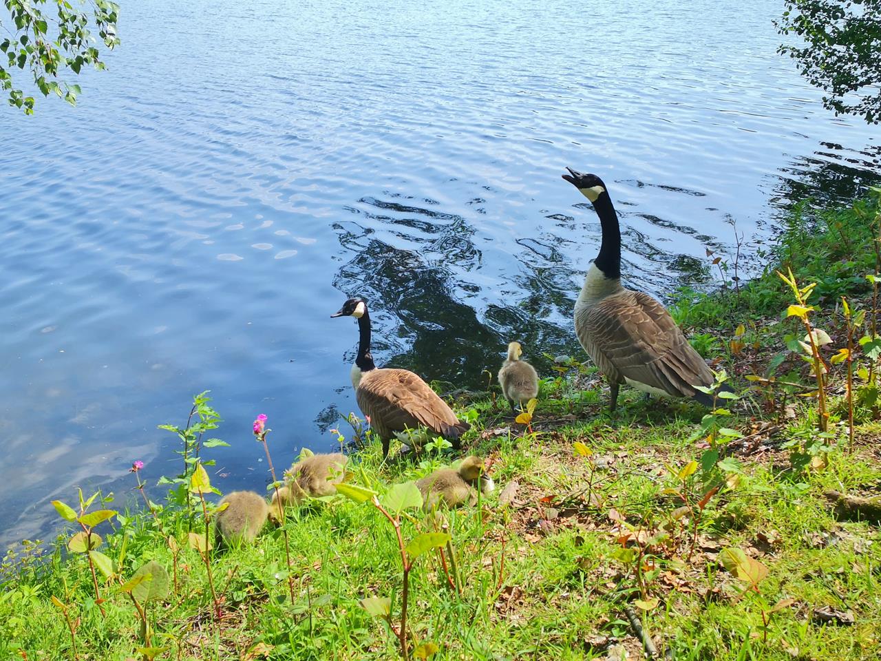 Mehrmals begegnen uns Wildgänse mit ihrem Nachwuchs