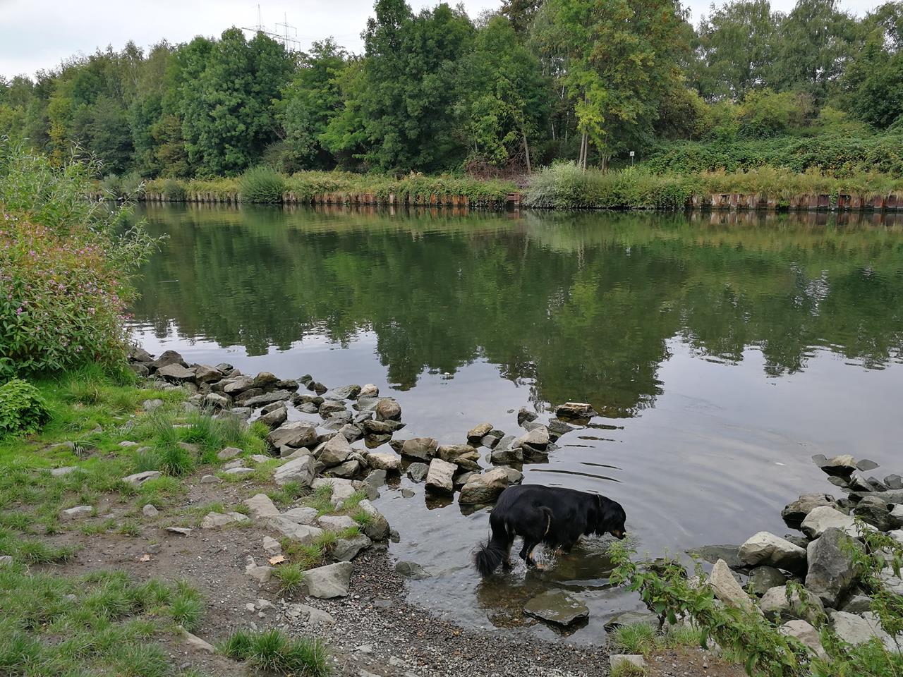 An den Park schließt sich der Berger See an, der 1930 aufgestaut wurde und der Freizeiterholung dient. Wir umrunden den See und laufen durch den Park am Seeende in Richtung der Halde Rungenberg, die den Abraum der angrenzenden ehemaligen Zeche Hugo trägt.
