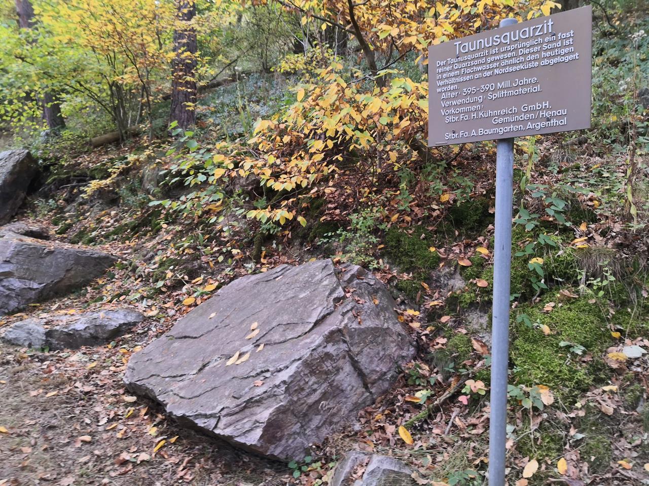 Der Lehrpfad zeigt die unterschiedlichen Gesteinsarten auf, die man im Hunsrück findet, und das sind nicht wenige. Aufgereiht sind sie entlang des gesamten Weges gemäß ihrer Entstehungsperiode im Laufe der 3,5 Milliarden alten Erdgeschichte, jeweils mit Infotafeln und Gesteinsproben.Teilweise kann ich die verschiedenen Gesteinsarten optisch gar nicht auseinander halten, teilweise sind die Unterschiede auf den ersten Blick sichtbar.