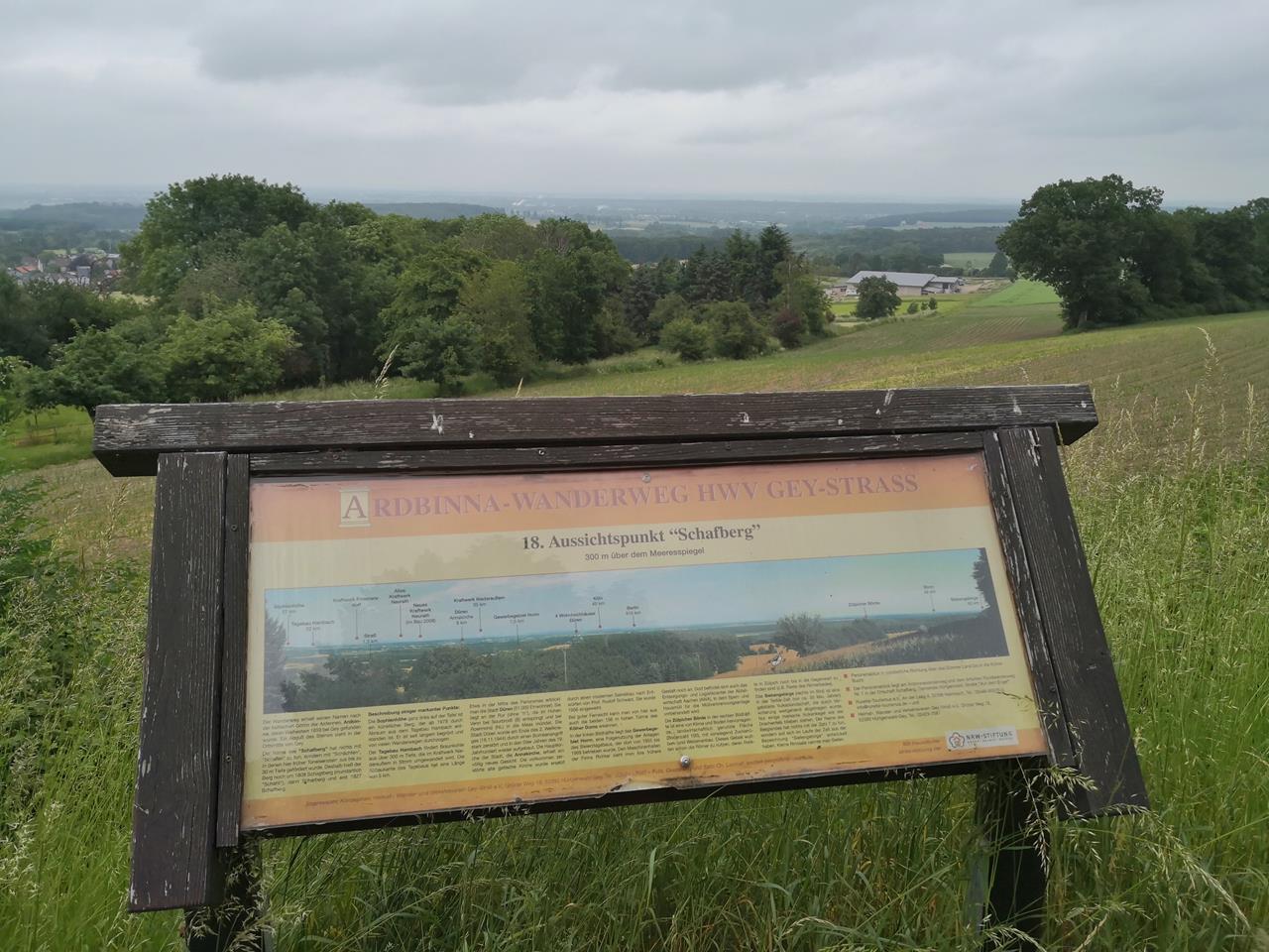 Am höchsten Punkt der Wanderung, am Fernmeldeturm Großhau am Geyberg, reicht der Blick sogar über Düren und Jülich hinweg bis zu den großen Kraftwerken bei Grevenbroich in 35 km Entfernung. Da könnte ich mit einem guten Fernglas ja fast bis zu mir nach Hause schauen 🙂