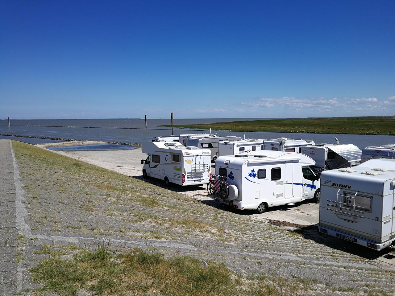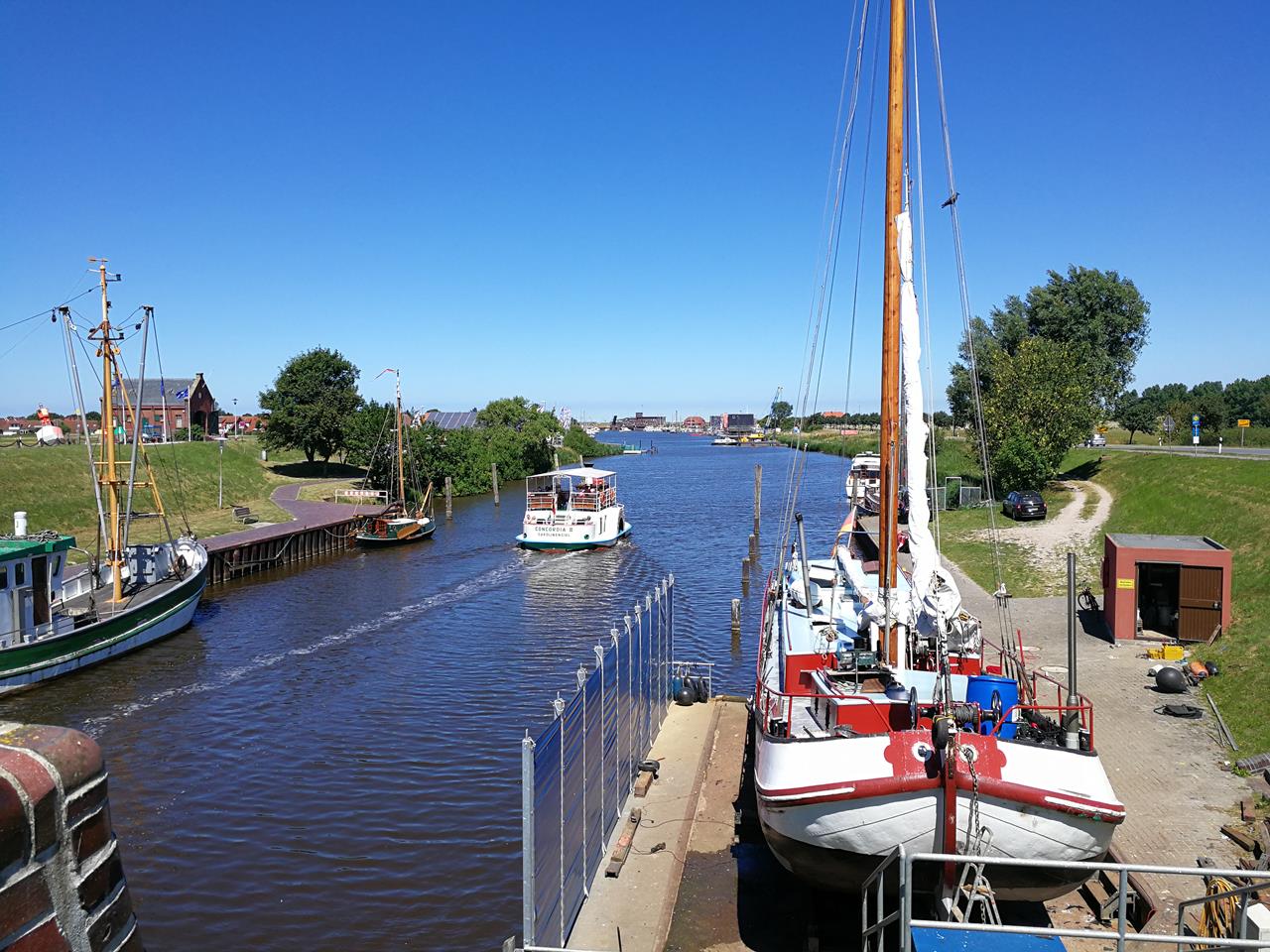 Auf unserer Fahrradtour nach Carolinensiel machen wir auch einen Abstecher in den nur rund tausend Meter entfernten Badeort Harlesiel an der Mündung der Harle in die Nordsee. Im Hafen legen die Fähren zur ostfriesischen Insel Wangerooge ab. Am großen PKW-Parkplatz endet die Bundesstraße 461.