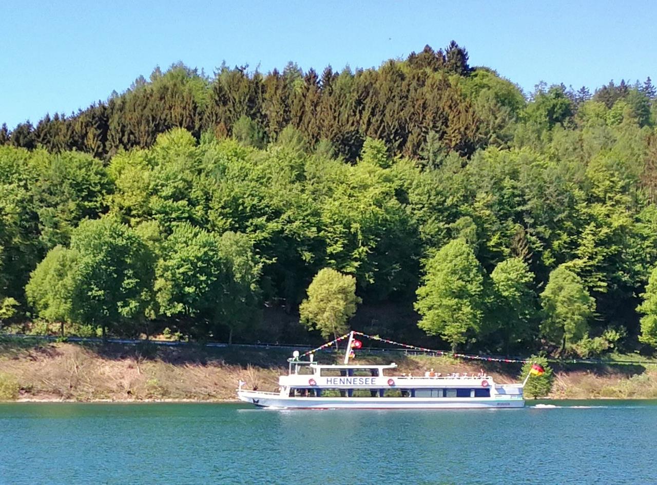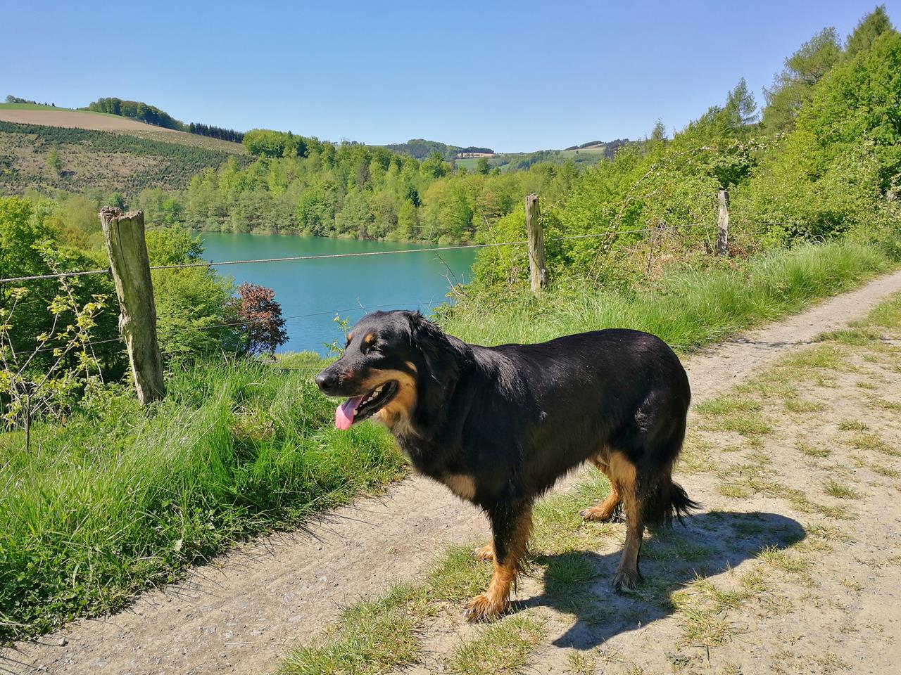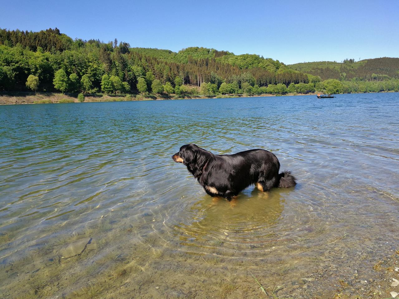 Dann folgen wir in südlicher Richtung ein Stück dem Uferweg, wobei es sich Doxi natürlich nicht nehmen lässt, die Wasserqualität des Stauesees zu testen. Auf dem See sind zu dieser Uhrzeit nur ganz wenige Segelboote und einige Angler unterwegs. Plötzlich ertönt eine laute Schiffssirene. Es ist das Ausflugsschiff „MS Hennesee“, das von Ostern bis Ende Oktober auf dem See verkehrt und Platz für 400 Personen bietet.