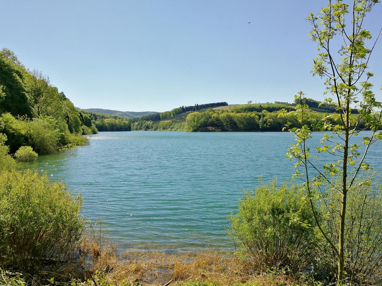 Bald steigen wir durch den Wald auf die Höhen östlich des Sees auf. Immer wieder eröffnen sich uns dabei herrliche Blicke auf den See und die umgebende Landschaft des Naturparks. Das Wetter ist einfach göttlich und die Frühlingsblüte hier oben in 500 Metern Höhe noch in vollem Gange. Schöner geht’s fast nicht.