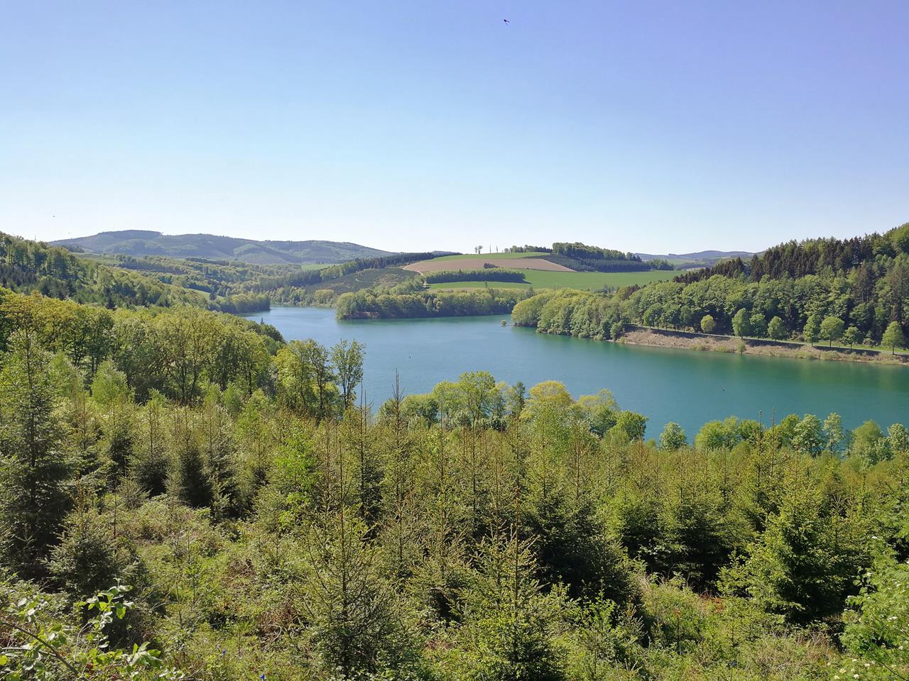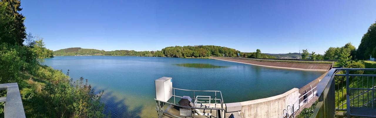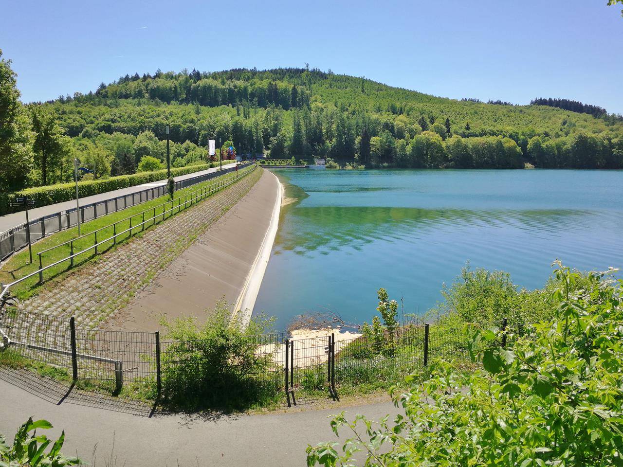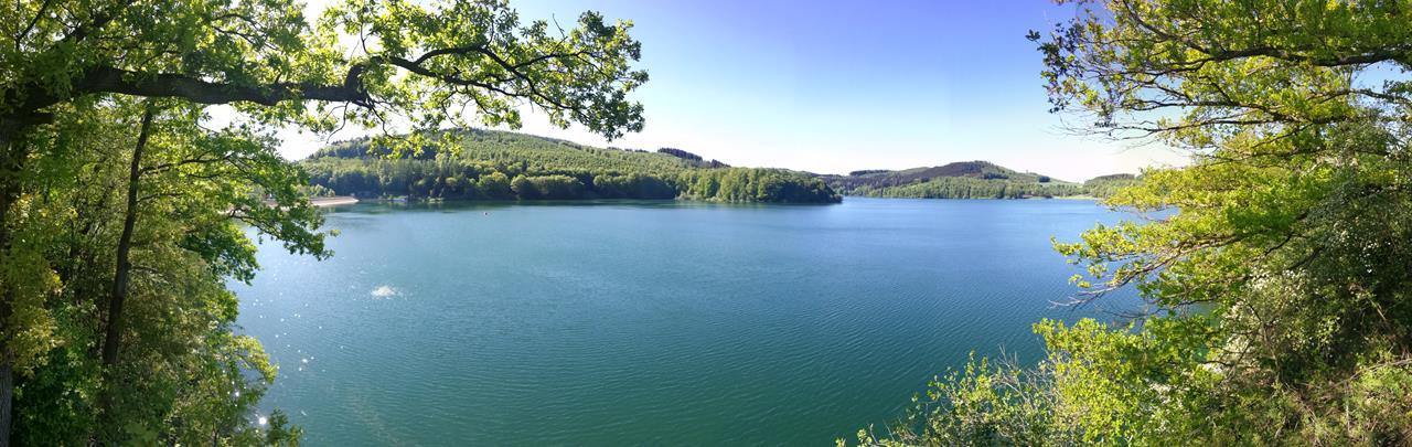 Die Hennetalsperre befindet sich bereits im Naturpark Sauerland-Rothaargebirge, wo wir am Morgen eine wunderschöne 10 Kilometer lange Wanderung am Ostufer des Sees hinauf zum beliebten Landgasthof Xaver’s Ranch unternehmen. Die an Wochenenden stark frequentierten Uferwege sind an diesem frühen Montagmorgen nahezu leergefegt.Wir laufen zunächst über die 370 Meter lange Staumauer, die einen schönen Blick hinunter nach Meschede bietet. Auf halber Länge passieren wir die 2015 eingeweihte „Himmelstreppe“, die vom Fuße des Staudamms geradewegs über 328 Stufen hinauf zur Dammkrone führt.