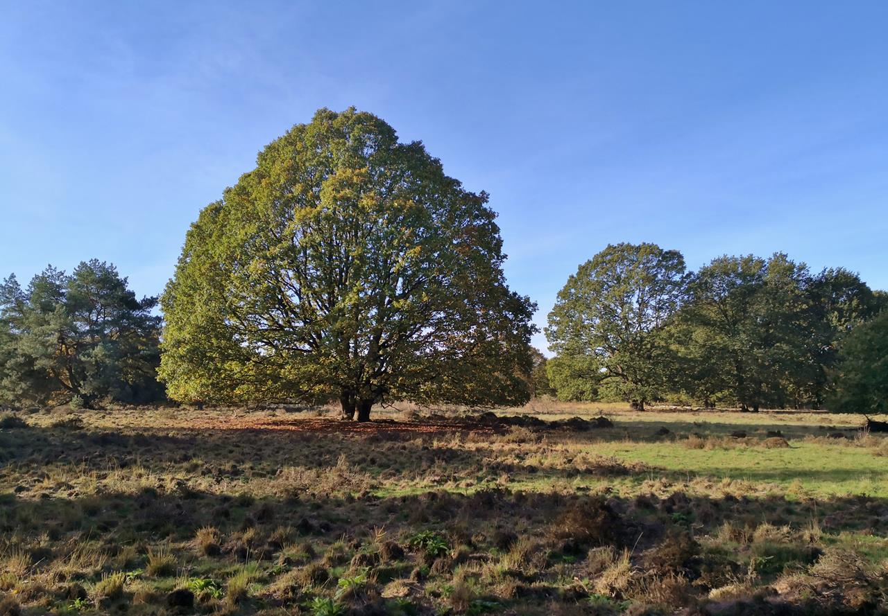 Mehr und mehr geht der Mischwald nun in offene Heidelandschaft mit vielen schönen, freistehenden Eichen und Kiefern über. Wir passieren die ersten Moore in der „Herkenbosscherheide“.
