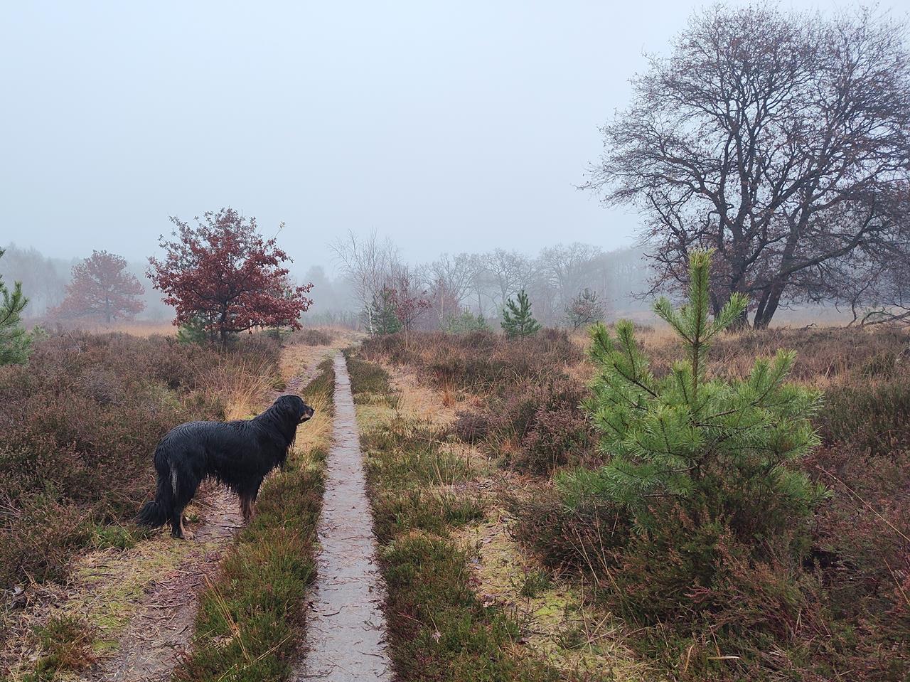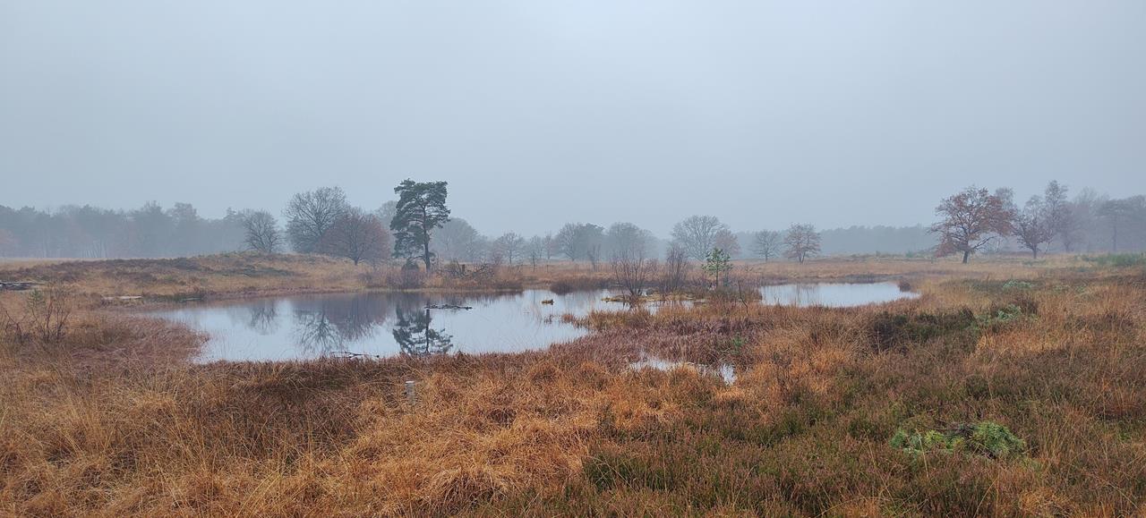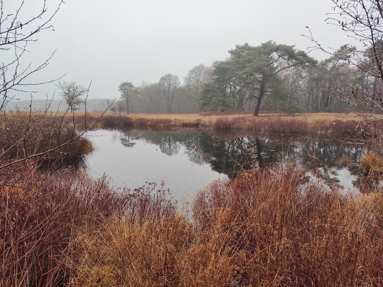 Vor vier Wochen war ich schon einmal auf der niederländischen Seite der Grenze bei Elmpt (D) in der Herkenbosscherheide unterwegs. Damals war die Stimmung herbstlich grau und nebelig, passend zum poetischen Namen eines der vielen kleinen Heideseen in der Region, dem Elfenmaar.
