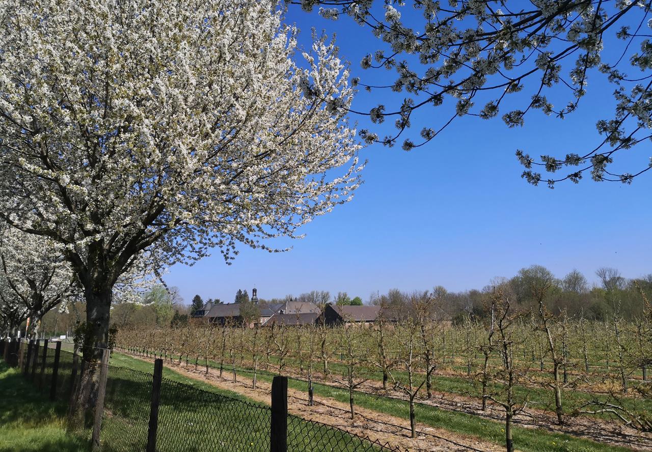 Vom Nikolauskloster zwischen Glehn und Damm laufen wir am schmalen Jüchener Bach entlang nach Aldenhoven und dahinter durch die Felder zu den Obstgärten am Schloss Dyck.