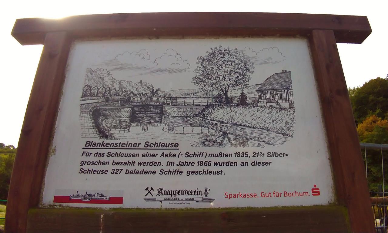 Vom Schloss laufen wir in Richtung des hübschen Kemnader Sees, der seit Ende der 1970er Jahr das Wasser der Ruhr aufstaut. Auf dem großen Klappenwehr am westlichen Seeende überqueren wir die Ruhr und laufen nun in westlicher Richtung über den gepflasterten Uferpfad. Auf diesem „Leinpfad“ wurden früher die Schiffe Ruhraufwärts durch Pferde oder Menschen gezogen („getreidelt“).In der Ferne können wir über der Ruhr bereits die Burg Blankenstein erkennen. Bald passieren wir die alte Blankensteiner Schleuse, bevor wir ein Stück Ruhrabwärts auf der großen Autobrücke über das Ruhrtal wieder auf die südliche Flussseite wechseln.