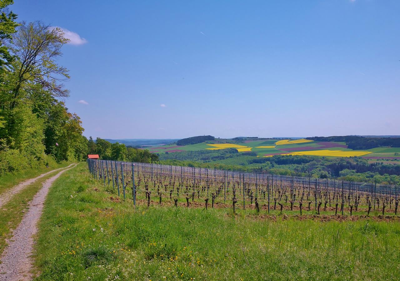 Dort geht der Wald in die Weinberge nördlich von Külhsheim über, und wir können vom Rastplatz wunderbare Fernblicke in das Tal des Amorbachs und darüber hinaus genießen. Am Horizont taucht der blühende Raps die Feldflächenin leuchtendes Gelb.