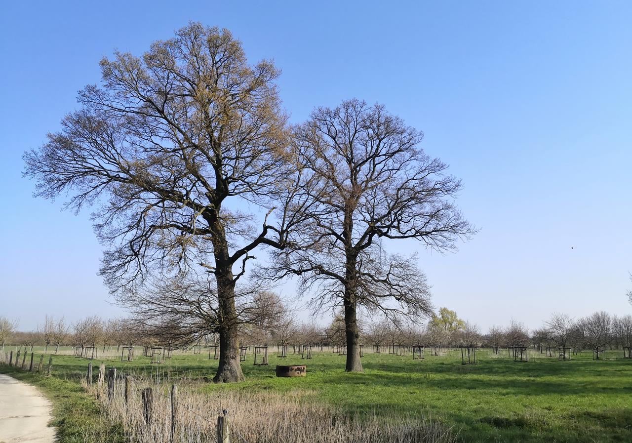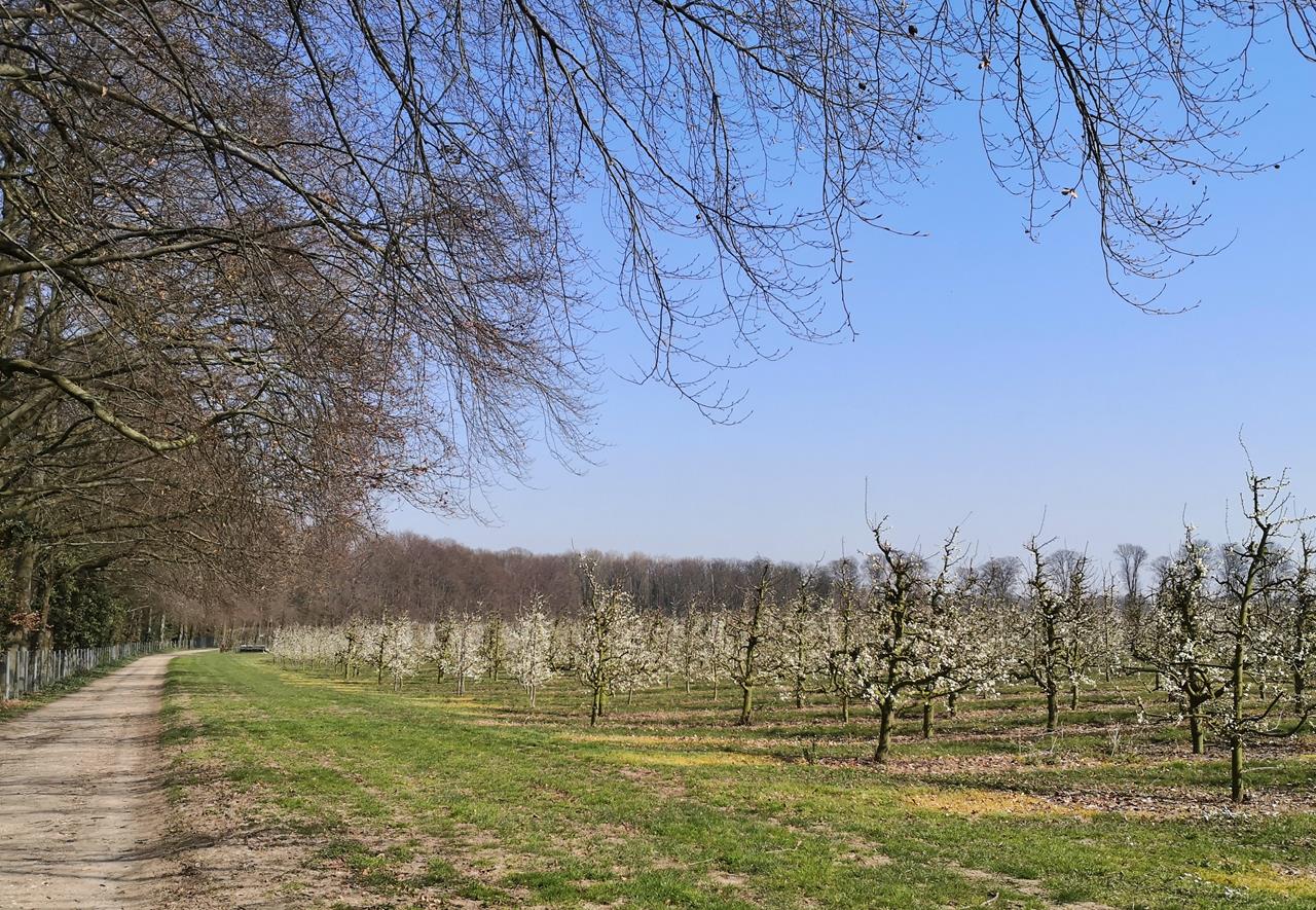 Hinter Wallrath umrunden wir nordwestlich von Aldenhoven das Schloss Dyck mit seinem wunderschönen Park. Rund um das Schloss befinden sich ausgedehnte Obstplantagen, in denen bereits die ersten Apfelsorten blühen.