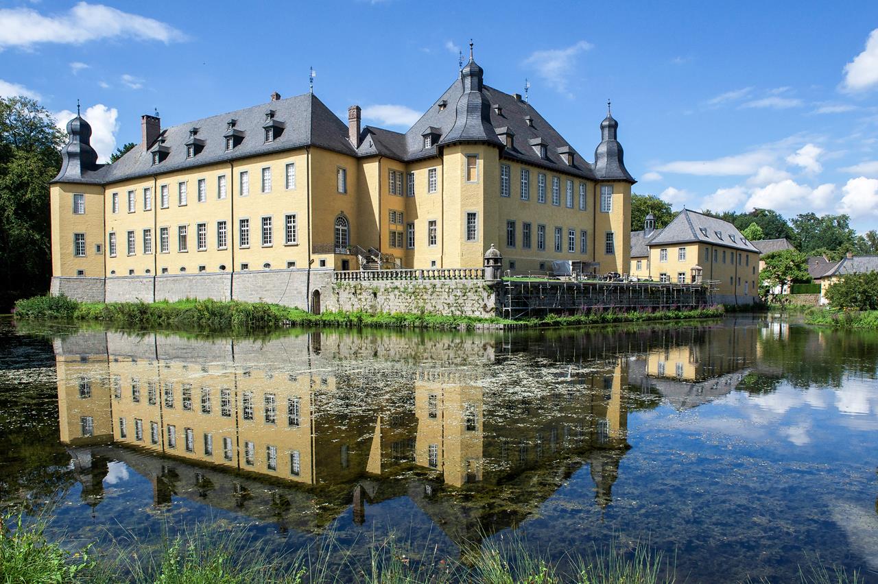 Schloss Dyck, das sich heute im Besitz einer Stiftung befindet, gilt als eines der bedeutendsten Wasserschlösser des Rheinlandes. Die Anlage besteht aus einer Hochburg und zwei Vorburgen, die von einem Wassergraben umgeben sind.