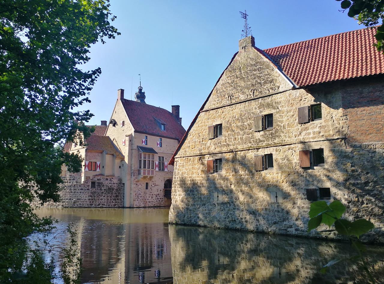Am Rande der Innenstadt befinden sich die repräsentativen Wasserburgen Burg Vischering und Burg Lüdinghausen. Nicht mehr so richtig als Burg zu erkennen ist die Dritte im Bunde, die Burg Wolfsberg, die heute eher wie ein herkömmliches Stadthaus wirkt.Besonders gut gefällt mir, dass es am Rande der Altstadt zwischen den Burgen so viel Grün und Wasser gibt. Neben den wirklich schönen Burgen entdecke ich bei meinem ausgiebigen Ortsspaziergang jedoch nur relativ wenig historische Bausubstanz. Ein Grund dafür ist der große Brand von 1832, bei dem die gesamte innere Stadt um den Markt und auch das Rathaus vollständig zerstört wurden.