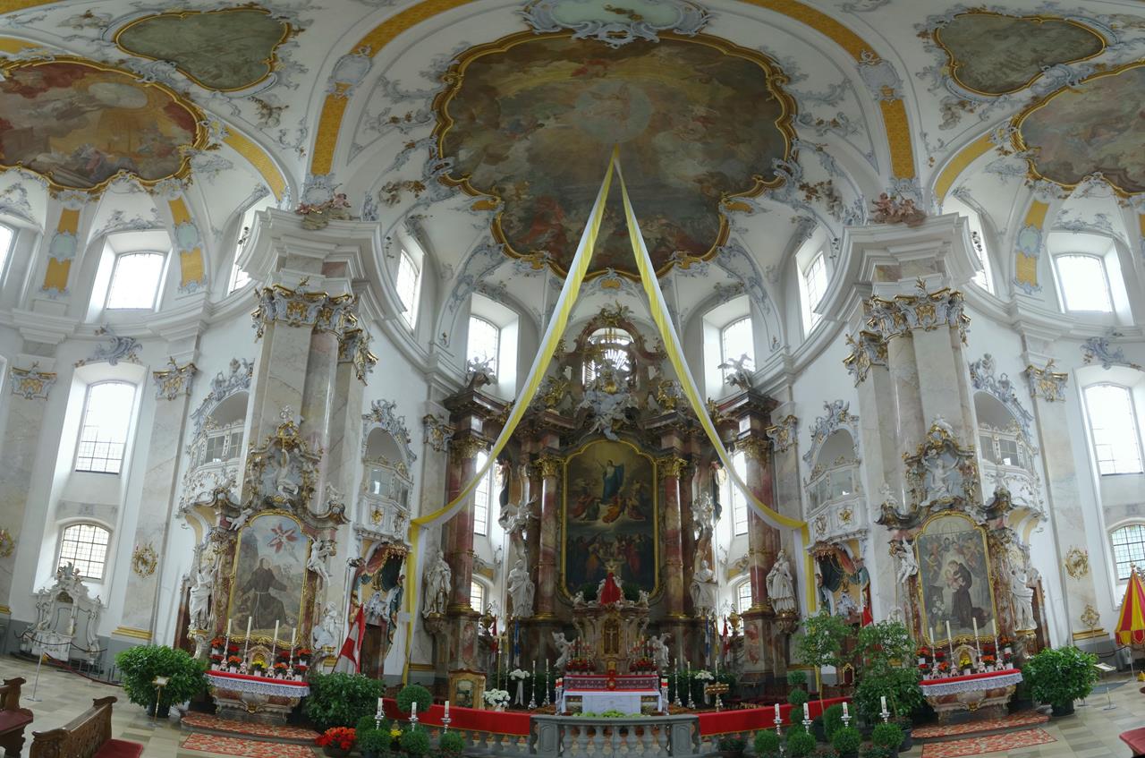 Die katholische Kirche St. Peter, bekannt für ihre reichhaltige Rokokoausstattung im Innenraum