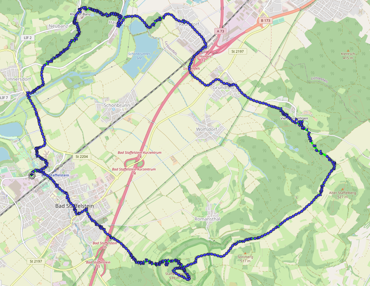 Bad Staffelstein, im „Gottesgarten am Obermain“ gelegen, hat in seiner näheren Umgebung viele Sehenswürdigkeiten zu bieten: Dazu zählen der nahe Staffelberg, die von Balthasar Neumann erbaute Basilika Vierzehnheiligen, sowie das Kloster und Schloss Banz. Diese drei Orte haben wir heute im Rahmen einer 21 Km langen Wanderung besucht.