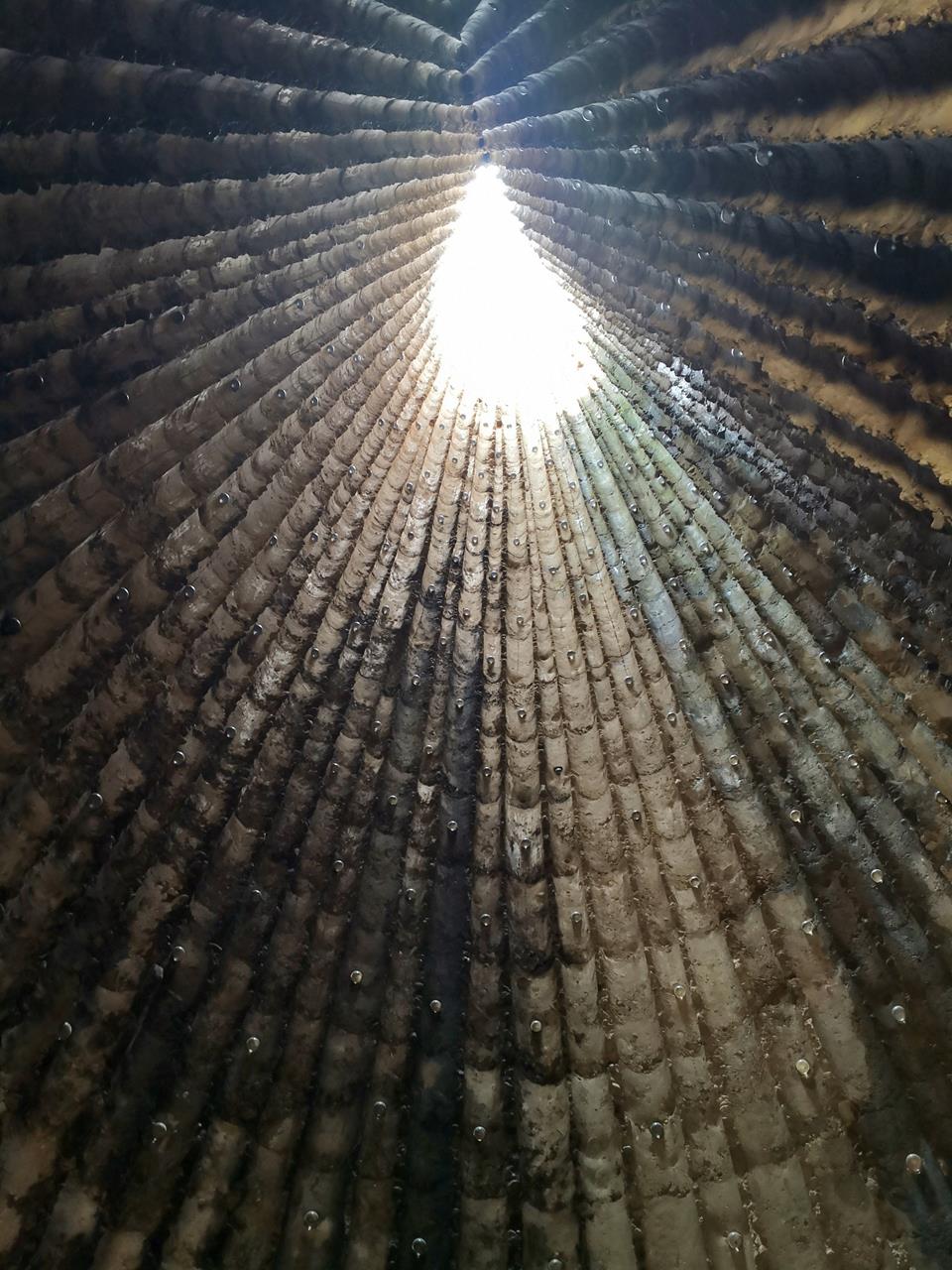 Der Innenraum, den man durch eine schwere, dreieckige Edelstahltüre betritt, wirkt wie eine Höhle aus in den Himmel gerichteten Fichtenstämme, die als Negativform in Beton gegossen wurden.
