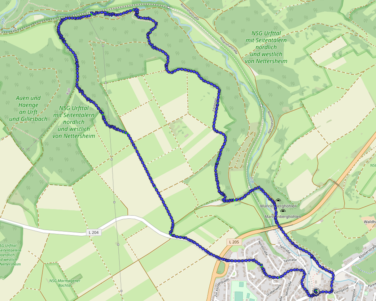 Wir starten am Bahnhof und laufen zunächst am Genfbach entlang. Nach einem Aufstieg auf die Hochfläche nördlich von Nettersheim geht es am „Grünen Pütz“ durch schönen Buchenwald hinab in das Urfttal.