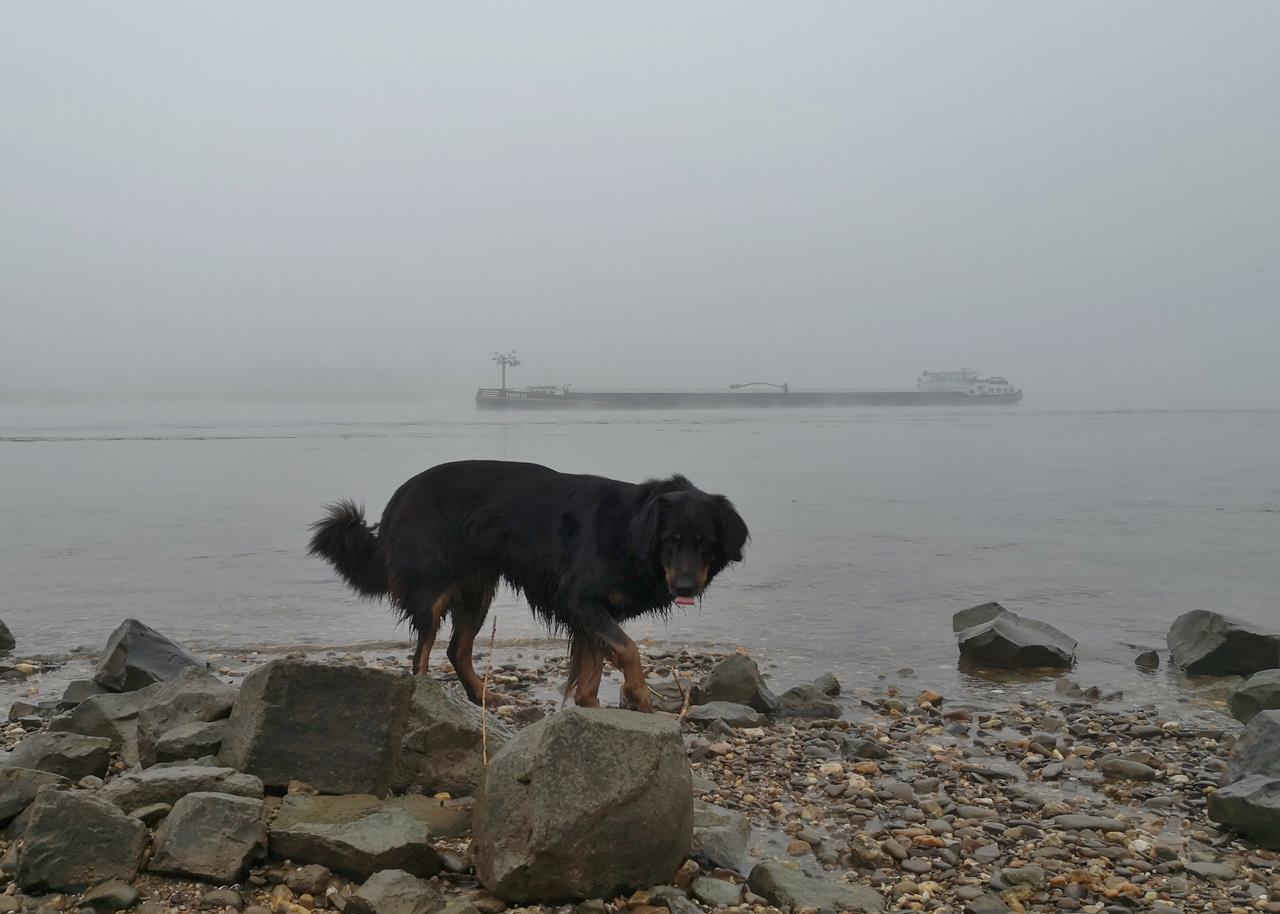 Doxi hat ein Stöckchen aus dem Rhein gefischt