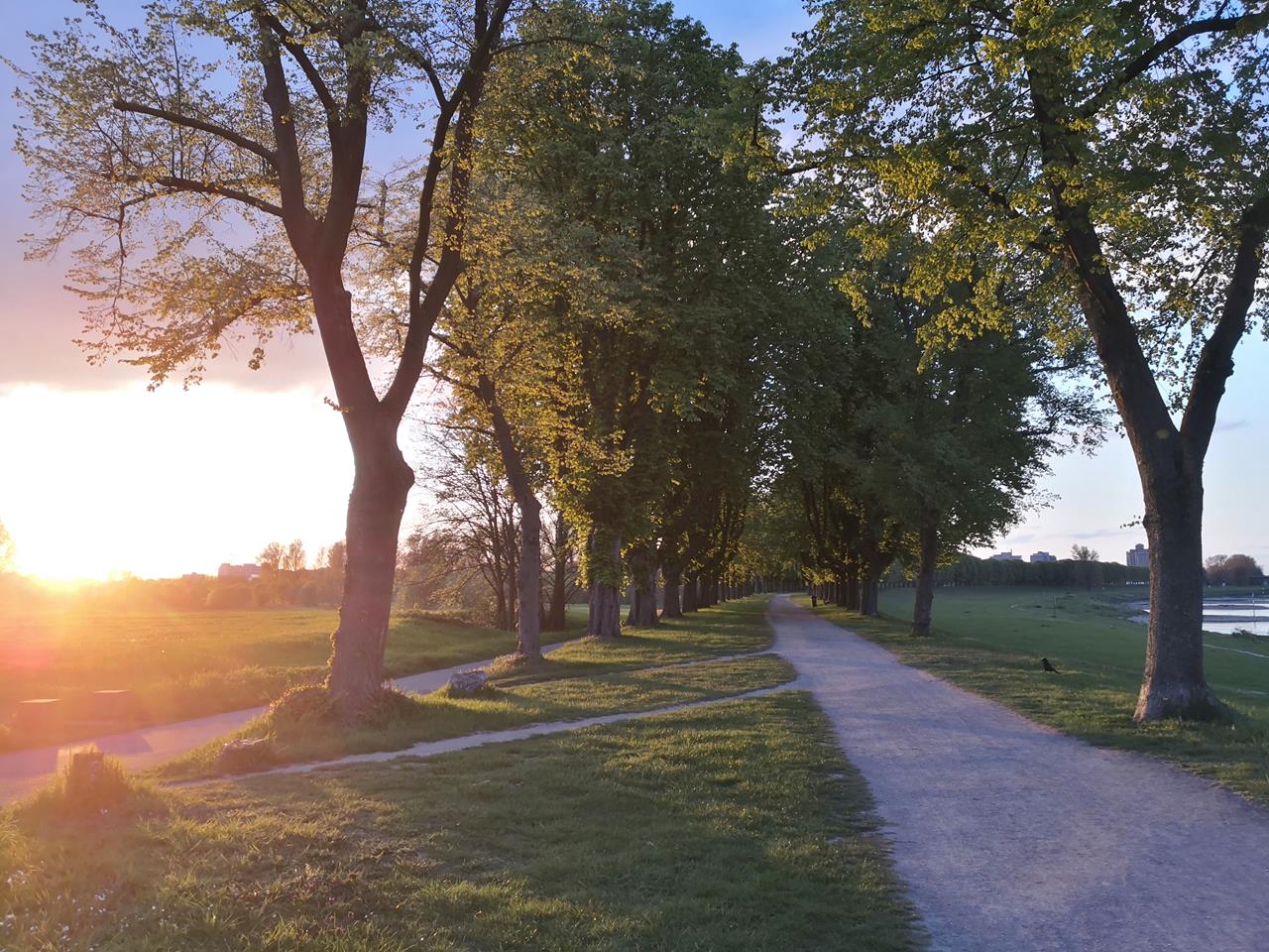 Wir starten unter einer abendlich grauen Wolkendecke, die wenig erwarten lässt. Doch als wir am Neusser Sporthafen eintreffen, lugt die untergehende Sonne gerade unter den Wolken hervor und taucht den Rheindeich in ein wunderbar warmes Licht. Toll sieht das aus!