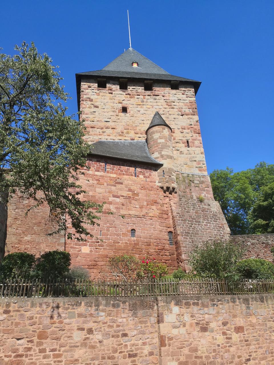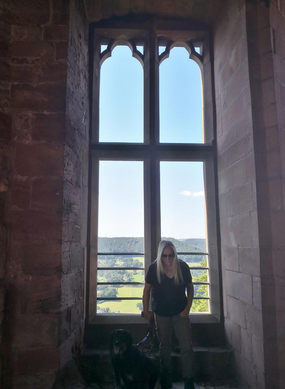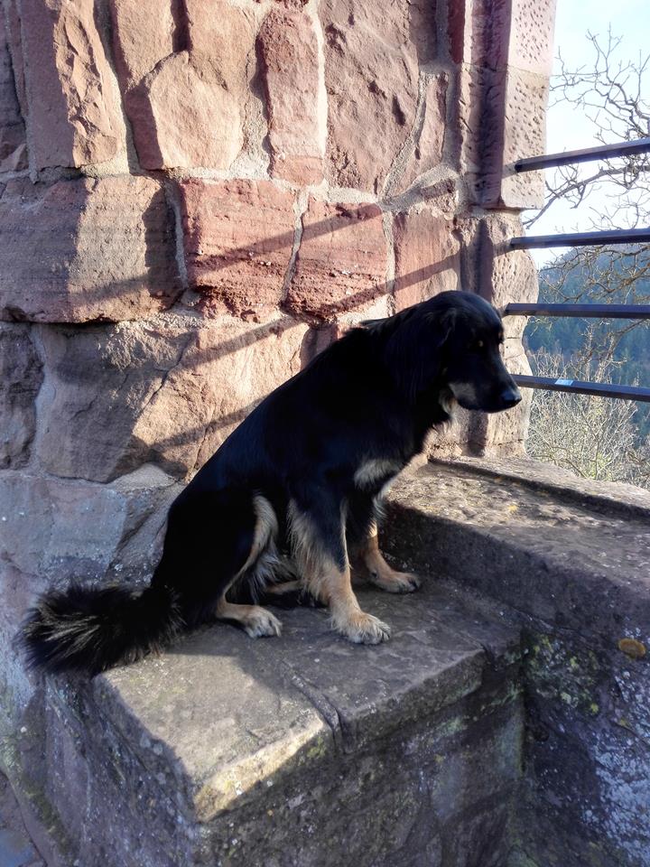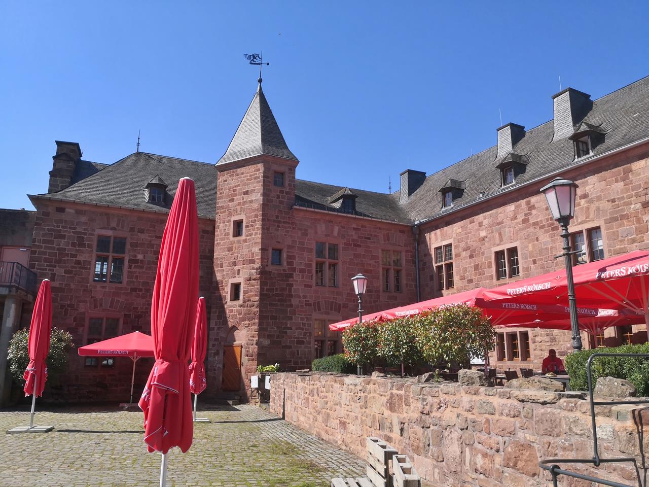 Bei herrlichem Sonnenschein laufen wir hinunter zur Rur. Kurz vor dem Forsthaus Hetzingen erreichen wir den Waldrand und blicken zur Burg Nideggen hoch über dem Rurtal.