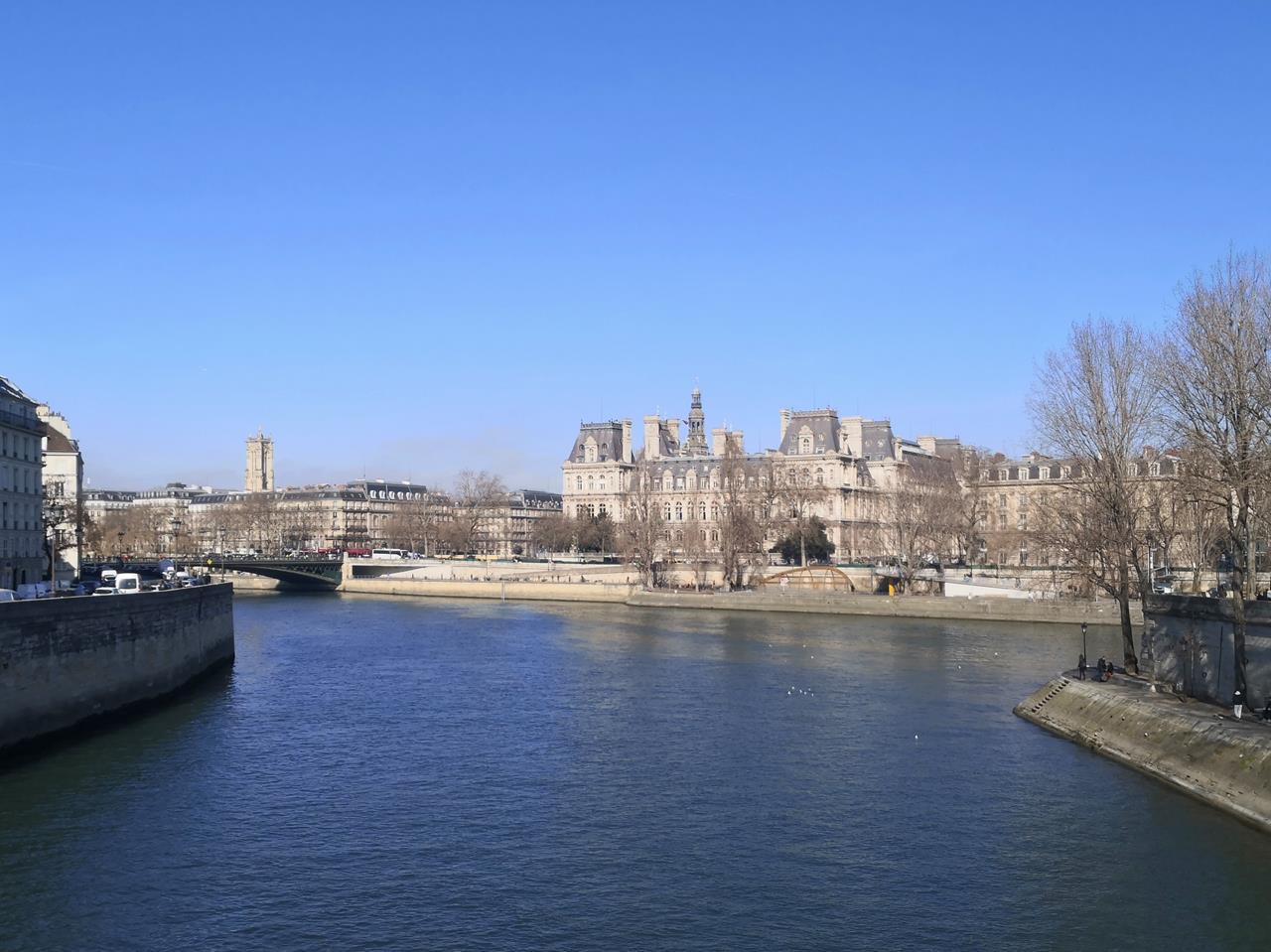 Seitlicher Blick von der Pont Saint-Louis über die Seine auf das Rathaus