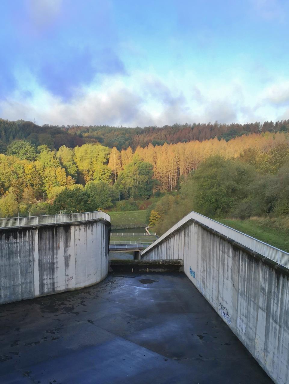 Wir starten an der Staumauer der Wuppertalsperre, die nach dem regenarmen Sommer zurzeit nur wenig Wasser führt.