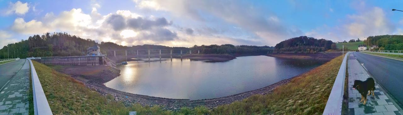 Panoramablick von der Staumauer der Wuppertalsperre am frühen Morgen