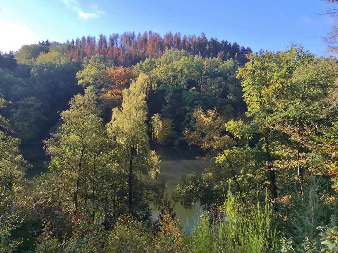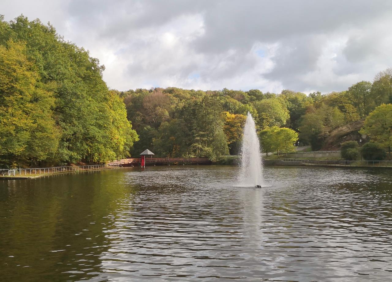 Hinter Dahlerau verlassen wir die Wupper und steigen auf die Höhen des Bergischen Landes auf. Dann geht es hinab ins Tal des Einstringhauser Baches und weiter in das Uelfetal mit dem schönen großen Teich am Uelfebad.