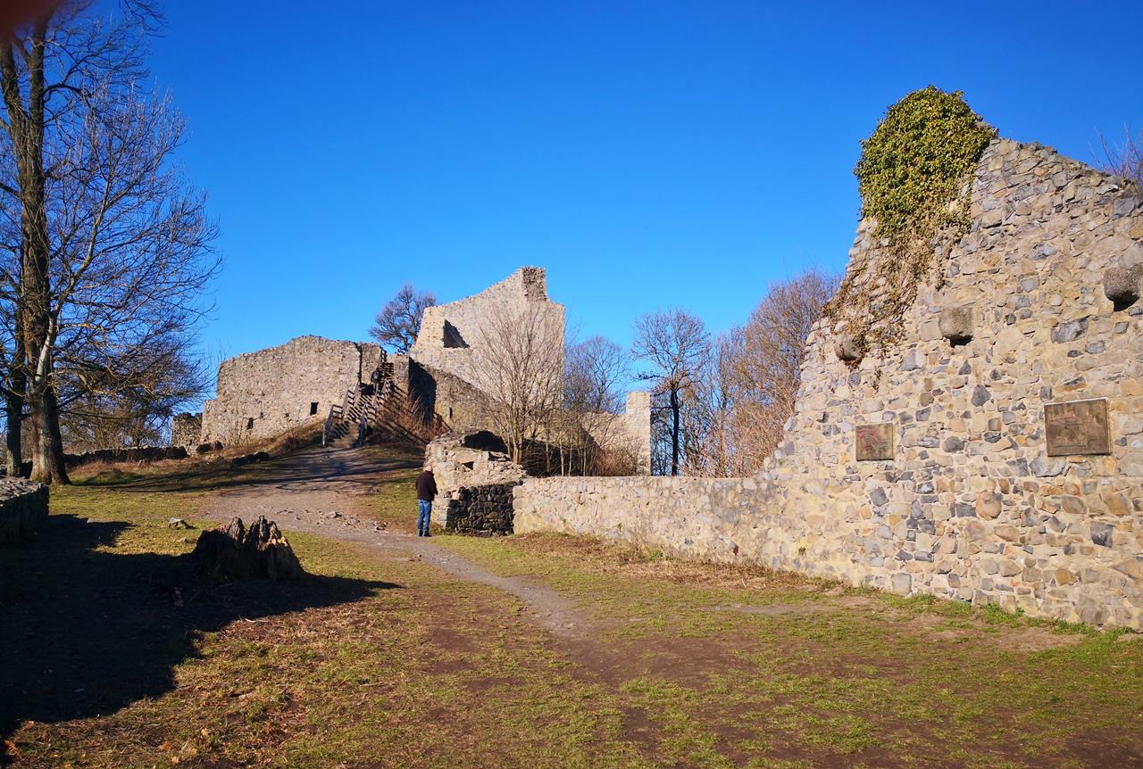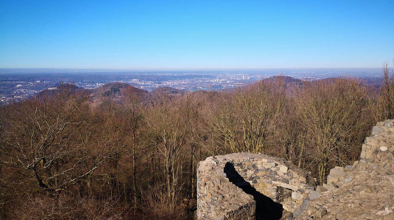 Über wenig begangene Wege schleust uns Gabi hinauf zur Ruine der Löwenburg, die einen spektakulären Blick in das Rheintal bietet. Im Norden breitet sich vor uns Bonn aus, dahinter Köln. Sogar die weit entfernten Kraftwerke bei Grevenbroich sind zu erkennen.