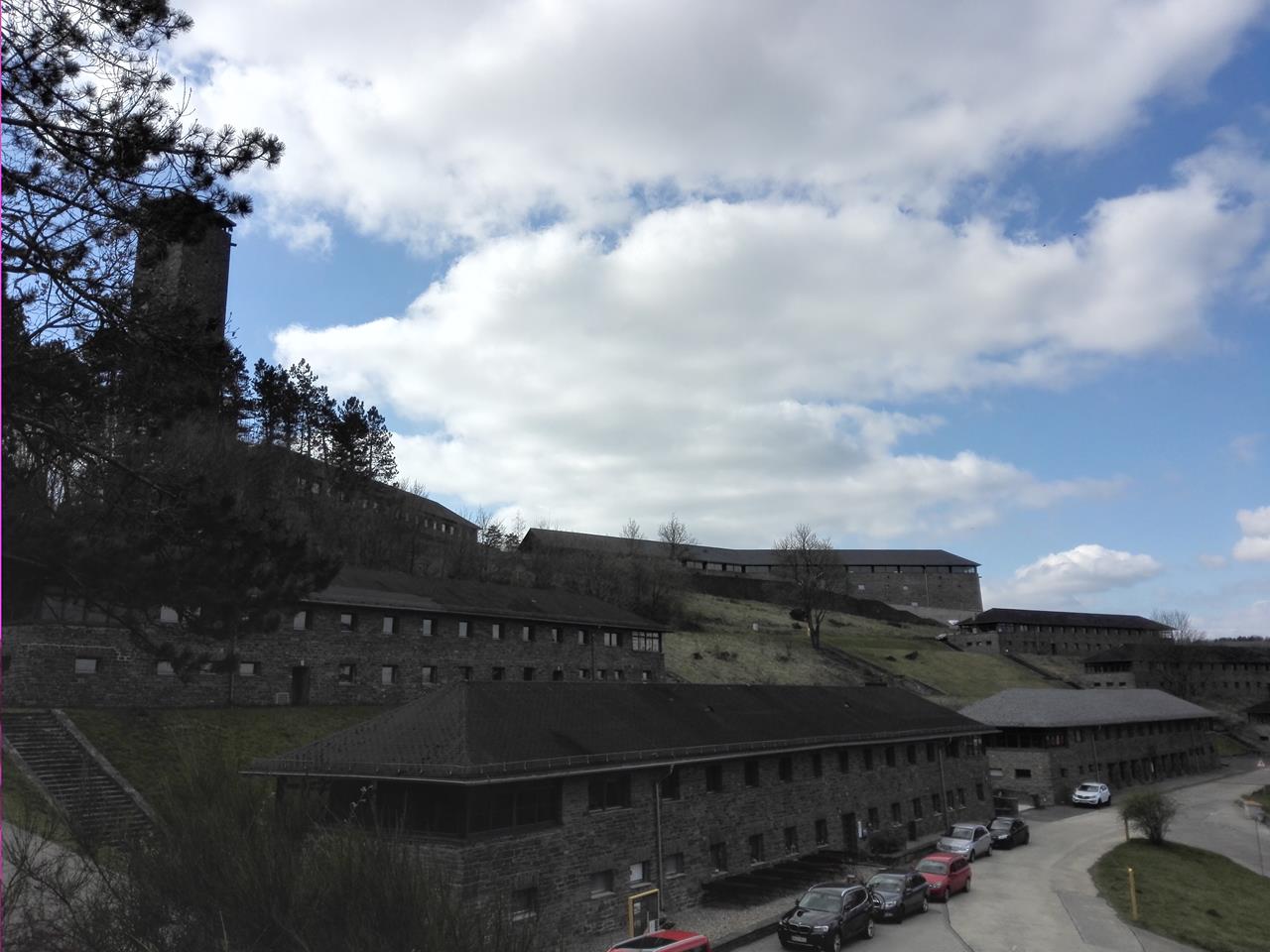 Wir laufen zur Hochfläche und an deren östlichen Rand entlang in südlicher Richtung, bis wir den Eingang zur Burg Vogelsang erreichen. Wir queren das große Gelände und steigen auf der Rückseite hinab zur Urft.