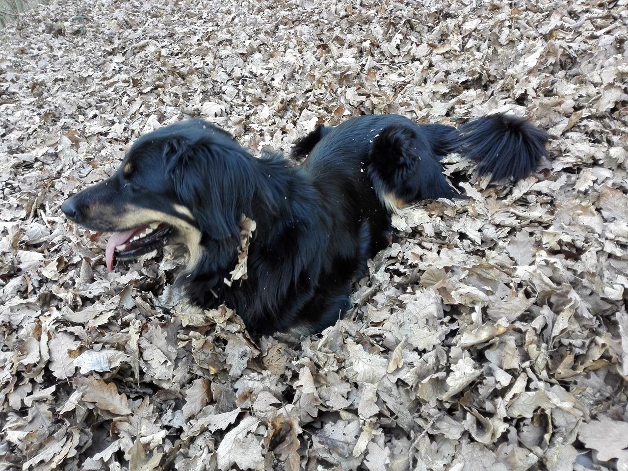 Doxi hat einen großen Laubhaufen entdeckt und wirft sich hinein. Das liebt sie.