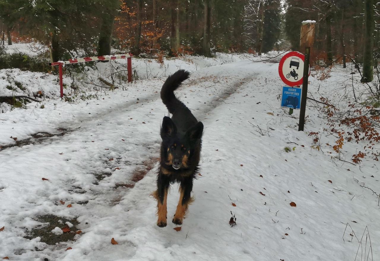Doxi hat total Spaß, durch den Schnee zu rasen. Immer wieder wirft sie sich auf den Boden und rollt sich genüsslich ab. Auf tief verschneiten Wegen stapfen wir durch das jungfräuliche Weiß und laufen weiter durch den Wald in Richtung Hirschrott.