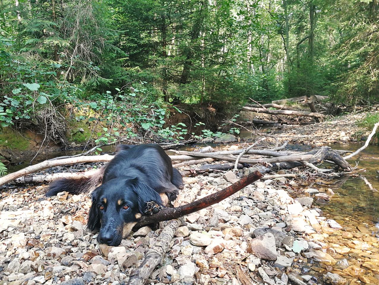Doxi genießt es, immer wieder durch den Bachlauf zu waten und wir erfreuen uns am lieblichen Plätschern und der kräftigen Vegetation am Flusslauf. Das Wetter heute ist herrlich, und so spiegelt sich die Sonne malerisch im Wasser.