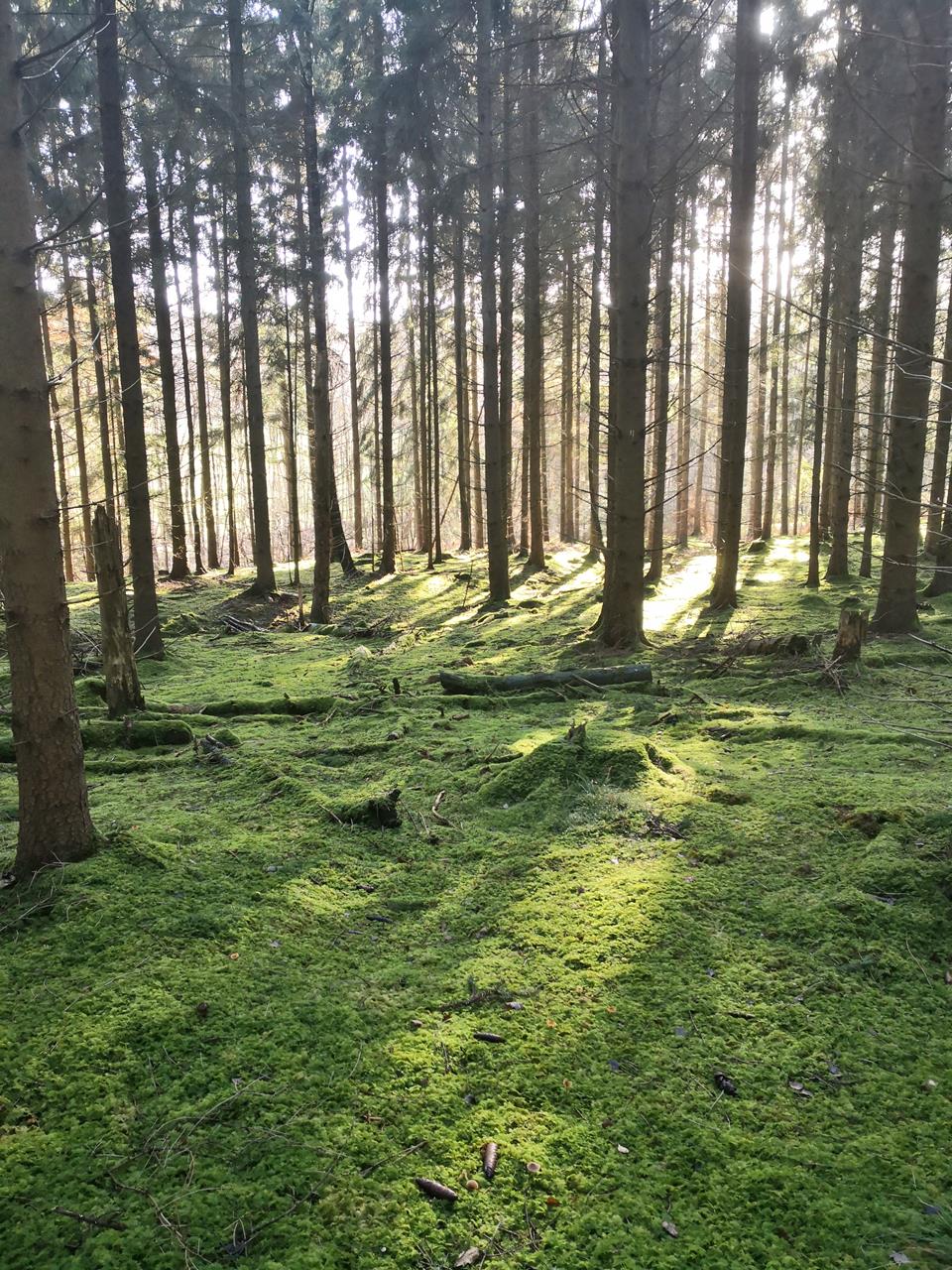 Komplett vermooster Waldgrund am Abhang oberhalb der Inde