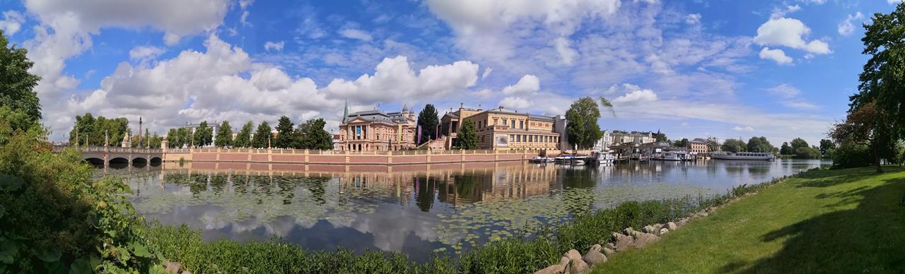 Gegenüber vom Schloss befindet sich der Alte Garten am Rande der Altstadt mit dem Staatstheater Mecklenburg und dem Kunstmuseum Schwerin. Weiter geht es mit der Staatskanzlei von Mecklenburg-Vorpommern und weiteren repräsentativen Bauten im klassizistischen Stil.