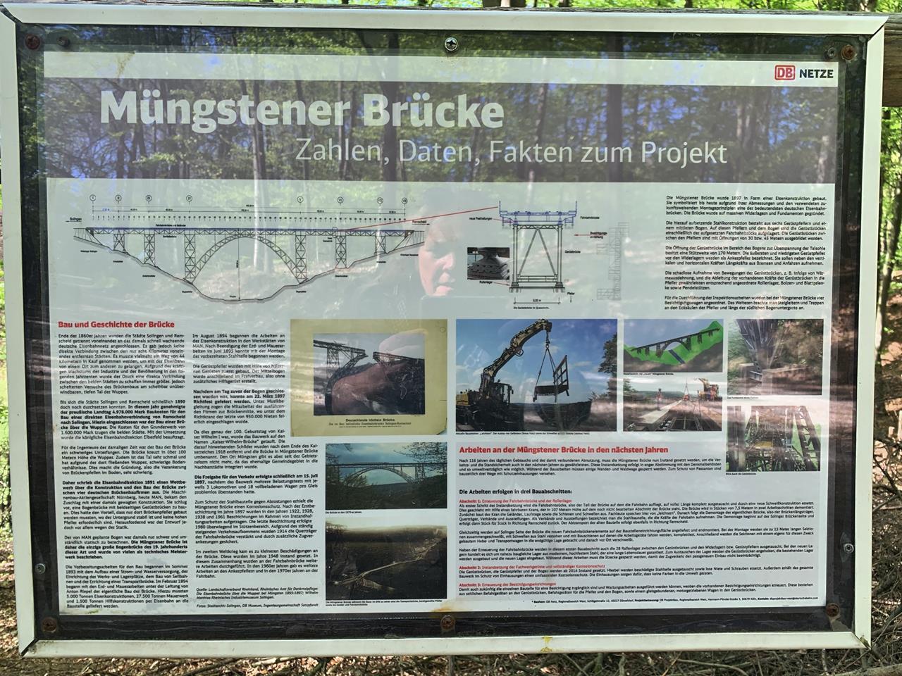 Die 1897 eingeweihte ehemalige Kaiser-Wilhelm-Brücke ist nach wie vor die höchste Eisenbahnbrücke Deutschlands. Die mächtige Stahlkonstruktion überspannt zweigleisig in 107 Metern Höhe das Tal der Wupper zwischen den Städten Remscheid und Solingen.