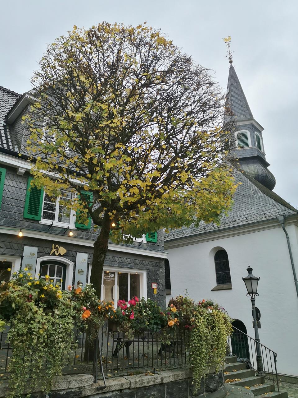 In den engen Gassen drücken sich schiefergedeckte Häuser mit weißen Fensterrahmen und grünen Läden aneinander. Dazu das bunte Herbstlaub der Bäume – richtig schön sieht das aus.